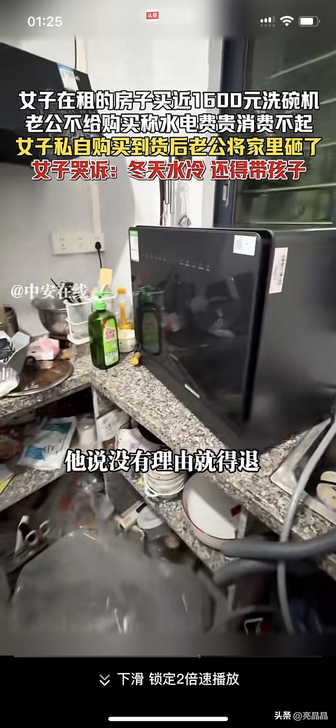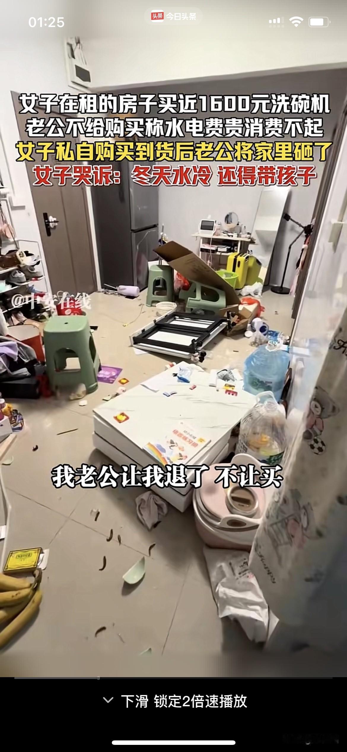 广东,一女子瞒着老公,花近1600元买了洗碗机,老公要求退,女子不同意,老公气得把家砸了,女子哭诉:不明白为什么不让买?是因为自己不上班吗? 女子觉得天冷水凉,不想洗碗,于是决定买洗碗机。老公接到安装师傅电话,得知妻子买了洗碗机,当时让她退掉,说我们不买,可女子没听,过了几天,机器到货就约了师傅上门安装。 老公一回家,看到师傅在安装,直接让师傅走人,要求妻子退款,女子不肯,说:“我不想洗碗,你又不洗,为什么不能买,你给我一个理由。” 老公反驳:“没有理由就是得退,水电费都贵,我们消费不起。” 女子认为老公轻松月入过万,一千多的洗碗机完全消费得起,为什么不让买,天冷自己真的不想洗碗,而且洗碗机还能洗蔬菜水果,想让师傅继续安装。 老公见劝退不成,气急败坏地把客厅砸了,出租房全部家具被砸稀巴烂。女子见状,只能让师傅先走,马上申请退款,哭着出去住酒店。 网友说,女子一点不懂持家,自己不上班,老公一人养家压力很大的,出租房买什么洗碗机啊,不仅搬家麻烦,还占地方,嫌水凉,用热水洗就好了。在家带娃做点家务很正常。 也有网友说,男子真的太大男子主义,自己不洗碗,还不让老婆买洗碗机,老婆陪你在出租房熬,连个洗碗机都舍不得给老婆买,真不是男人。最可恨的是砸家,砸坏的这东西都够买一个洗碗机了。 我想说,这对夫妻都有错。女子不懂体谅丈夫养家的压力,丈夫不心疼珍惜才妻子做家务的付出。 最错的是,丈夫暴力砸家给两个孩子带来不可磨灭的伤害。孩子们肯定会想为什么我们的爸妈会这样?为什么要吵架?妈妈一个人在外会不会出事?爸爸很吓人,我以后在家都不敢说话了!客厅的一片狼藉,该怎么办? 家是大家的,夫妻双方要互相理解,互相包容,你心疼我的不容易,我体贴你的辛苦,才能经营好一个幸福有爱的家。暴力解决不了问题,只会让问题升级,静下心来,好好沟通,协商双方都满意的结果,才是家和万事兴的正解。