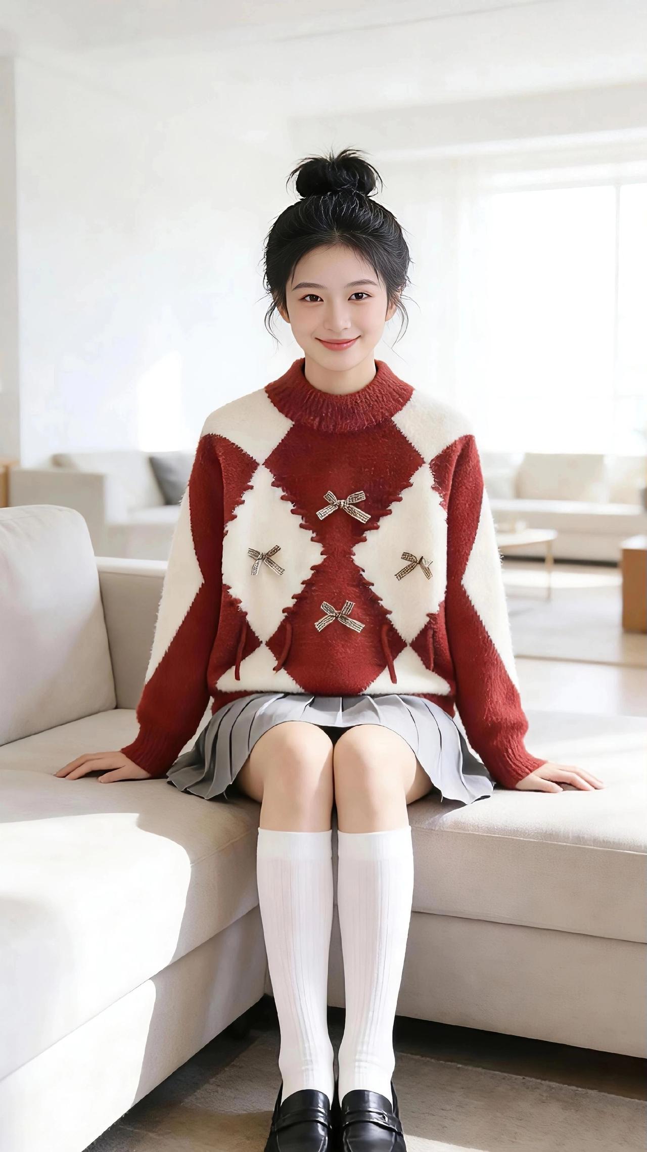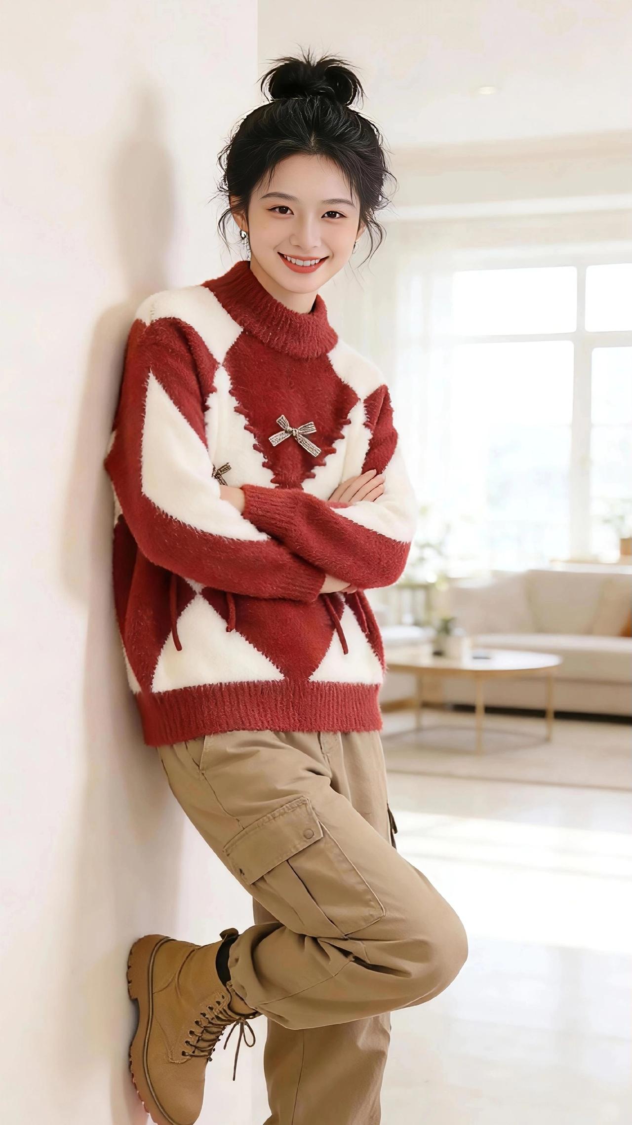 红菱暖冬 冬日的阳光总带着温柔的偏爱,穿过客厅的落地窗,在米白色的沙发与浅木色的地板上,织就一片融融的暖。 她立在光里,黑亮的发丝挽成蓬松的丸子头,几缕碎发被风拂得轻扬,像枝头雀跃的星子。冷白皮在暖光里晕出淡淡的粉,唇角弯起的弧度,是比窗外冬阳更明媚的光。身上的红菱格毛衣,是冬日里最鲜活的笔触,酒红与奶白交错的菱纹,像将焦糖与奶油揉进了针织的纹路里,几颗小巧的格纹蝴蝶结缀在衣身,似落了几粒甜甜的糖霜,让软糯的绒面多了几分俏皮的精致。 她忽而抬手轻触窗沿,目光望向窗外的冬日景致,笑意漫在眼底;又转身倚着白墙,单腿微抬,手臂交叠的模样,慵懒里藏着少女的灵动。指尖偶尔勾一下鬓边的碎发,或是将手插进口袋,身体微微倾侧,毛衣的菱纹随着动作轻轻起伏,像揉皱了一团温柔的云。 卡其色工装裤的飒爽、米白色直筒裤的温婉、深蓝色阔腿牛仔裤的随性,都被这件红菱毛衣揉进了冬日的柔软里。每一个姿态,都是少女与冬的私语,是暖融融的室内,与寒凛冬日撞个满怀后,揉出的温柔涟漪。 阳光淌过毛衣的绒面,留下细碎的光斑,她的笑靥在光影里晃荡,像盛了一捧冬日的甜,让这一方客厅的时光,都慢下来,暖起来,成了冬日里最熨帖的风景。 高级感穿搭小个子穿搭 新年穿搭 针织衫