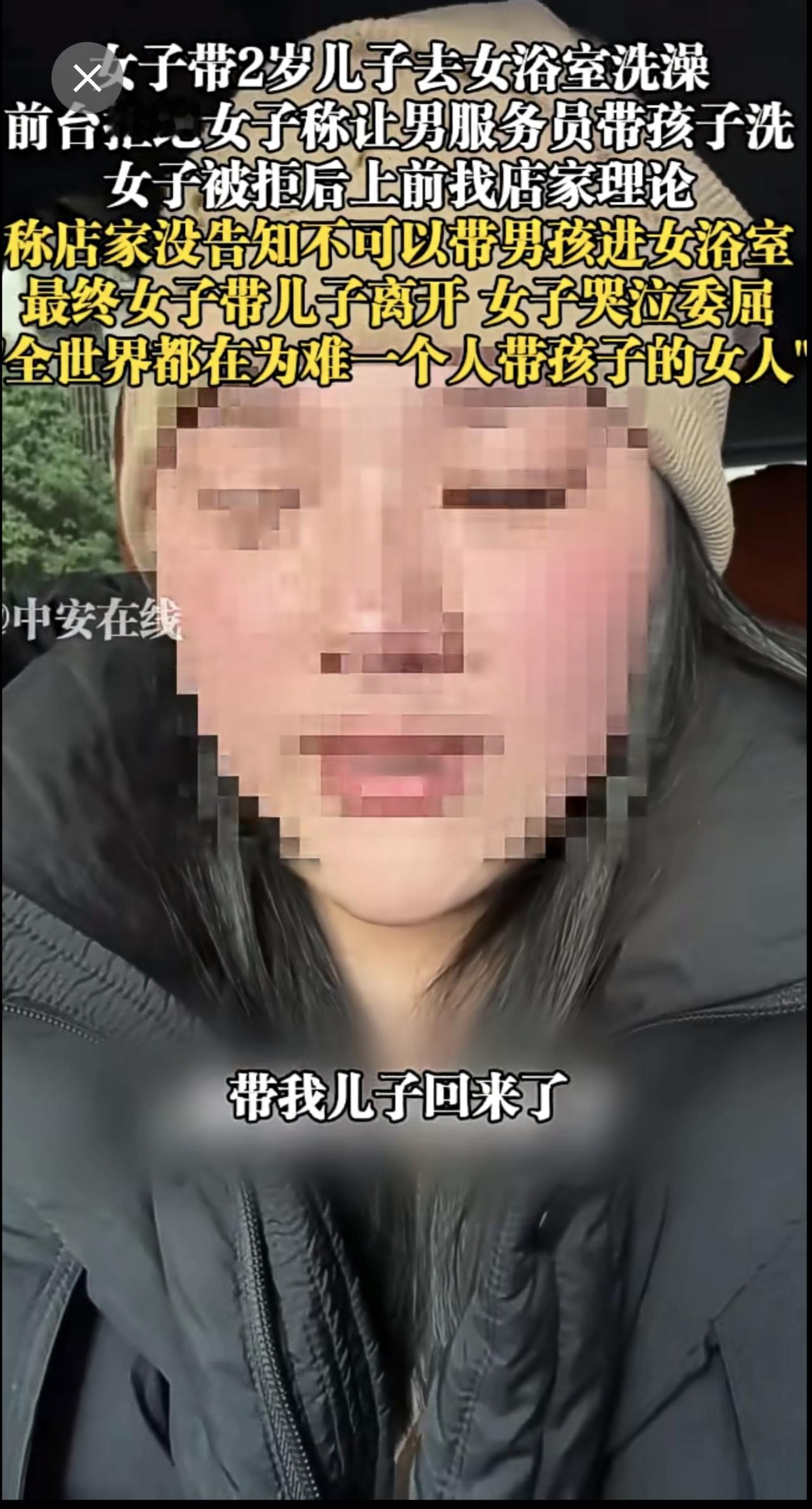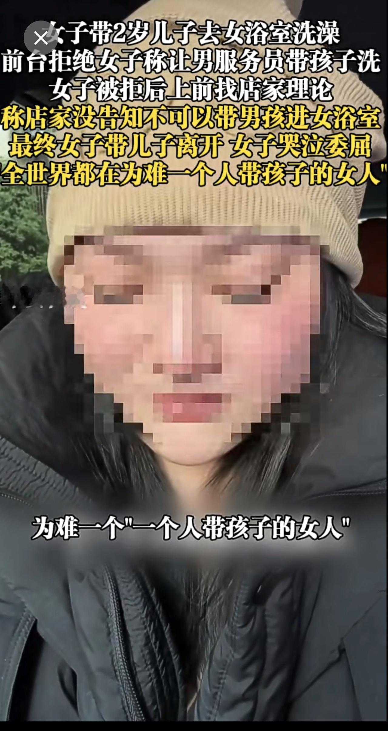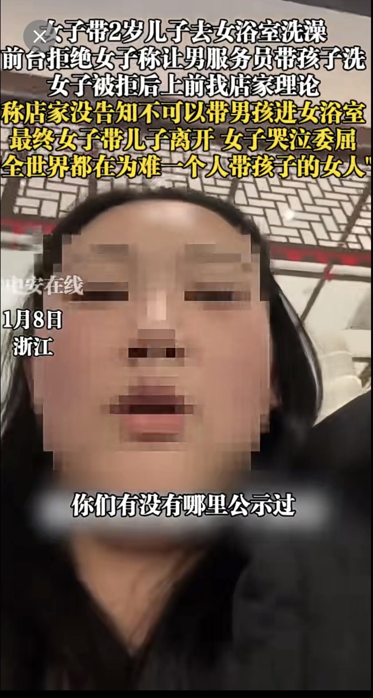 1月8日,浙江。女子带2岁儿子去女浴室洗澡,前台拒绝女子要求称可以让男服务员带孩子洗,女子被拒后上前找店家理论,称店家没告知不可以带男孩进女浴室,最终女子带儿子离开,女子哭泣委屈:"全世界都在为难一个人带孩子的女人" (陈三多)