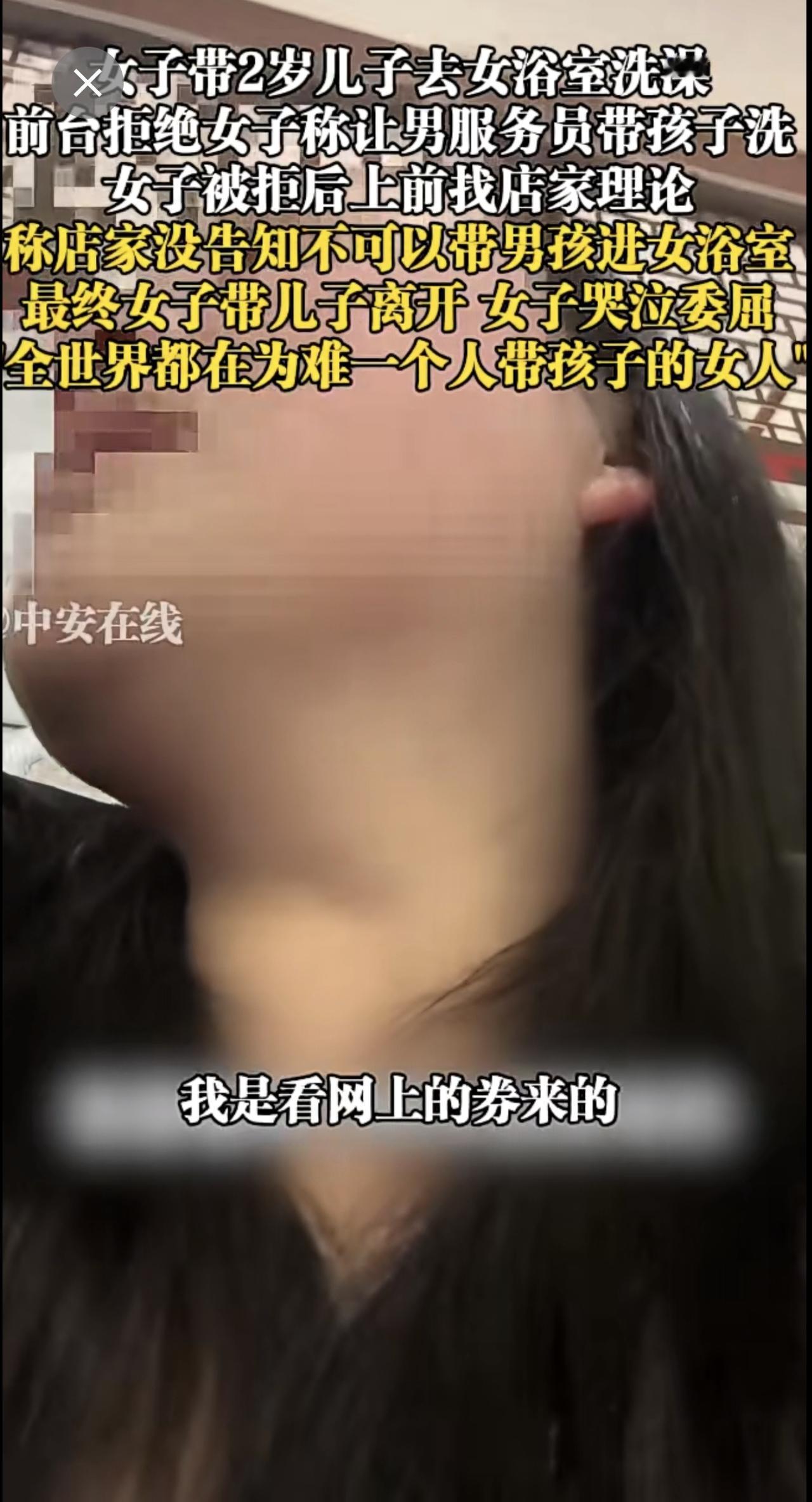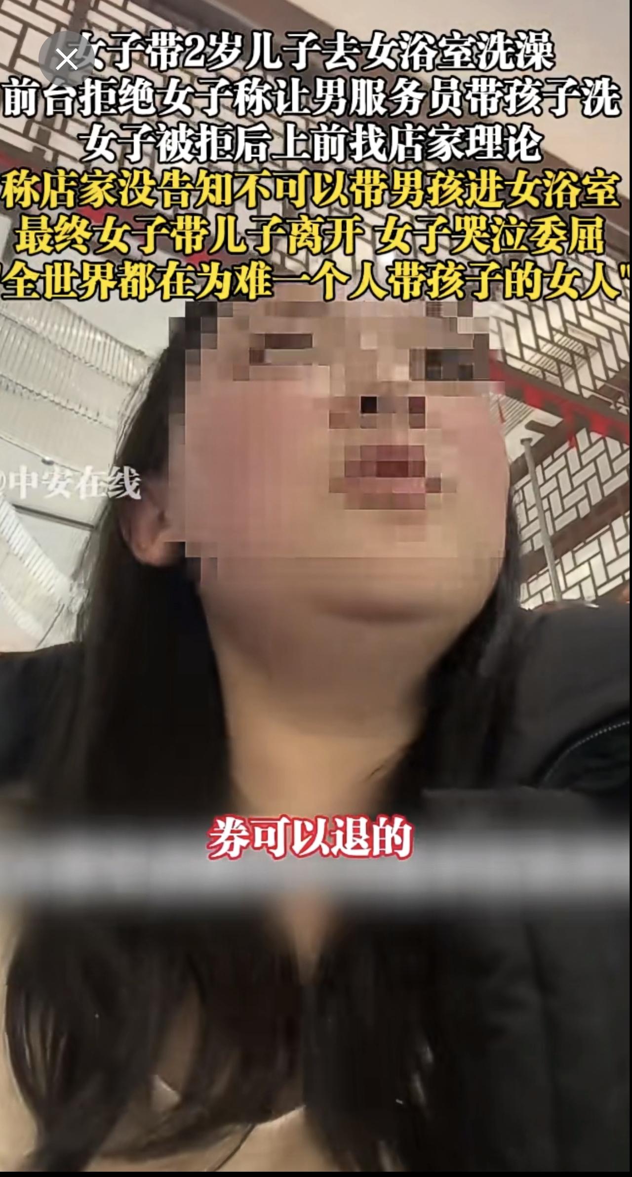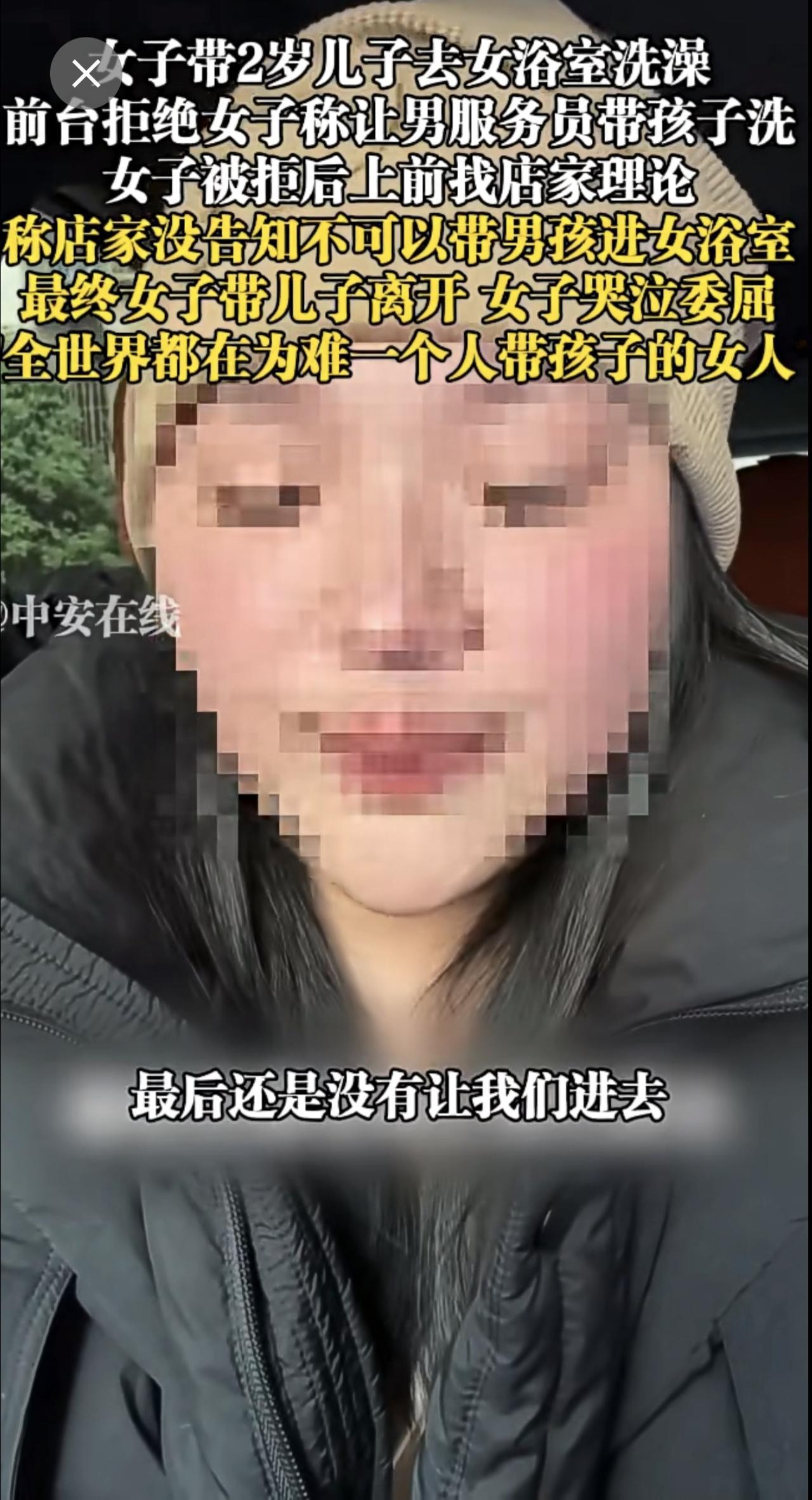 1月8日,浙江。女子带2岁儿子去女浴室洗澡,前台拒绝女子要求称可以让男服务员带孩子洗,女子被拒后上前找店家理论,称店家没告知不可以带男孩进女浴室,最终女子带儿子离开,女子哭泣委屈:"全世界都在为难一个人带孩子的女人" (陈三多)