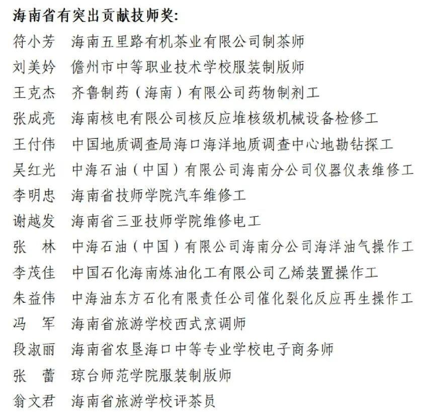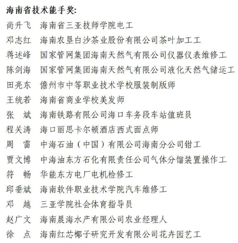 为深入贯彻落实中共中央办公厅、国务院办公厅《关于加强新时代高技能人才队伍建设的意见》,大力弘扬劳模精神、劳动精神、工匠精神,营造尊重劳动、崇尚技能、鼓励创造的社会氛围,根据《海南省优秀高技能人才奖评选奖励实施办法》(琼办发〔2015〕10号),经个人申请、单位推荐、市县(省行业)评审委员会评审、省评审委员会评审、实地考核、厅党组会研究、公示、省委人才工作领导小组审议等程序,并报省委、省政府批准,决定授予布丹等45名同志第三届“海南省优秀高技能人才奖”。