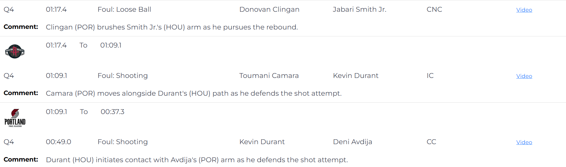 比赛最后1分09秒,杜兰特行进间抛投打进并造成卡马拉犯规打成2+1,但该球卡马拉并未与杜兰特有身体接触,不该吹罚投篮犯规。