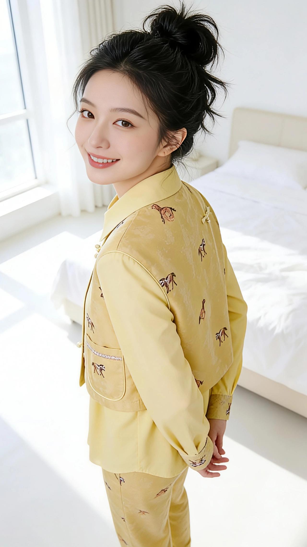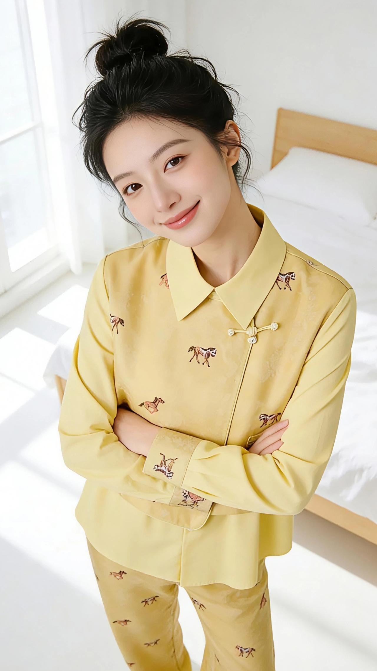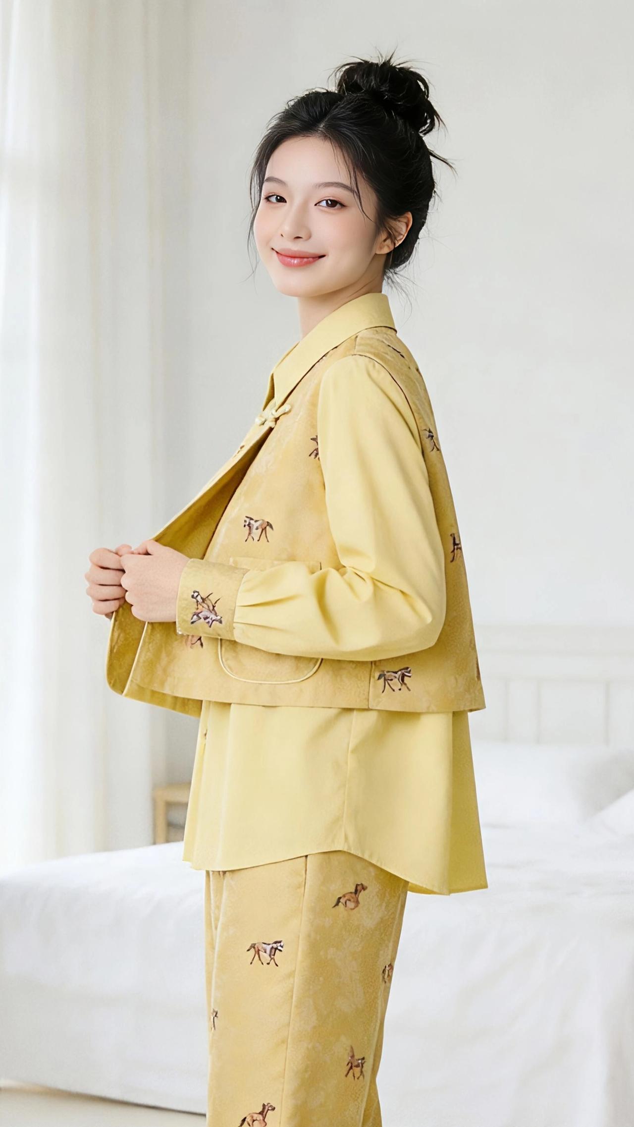 暖黄里的新中式温柔 晨光透过素白的窗纱,漫进简约的室内,将空气揉成了柔软的奶白色。她站在这片温柔的光影里,明黄的新中式套装,像揉碎了的阳光,落在身上,漾开一圈暖融融的光晕。 乌黑的丸子头松松挽着,几缕碎发被晨光吻过,贴在冷白皮的颊边,添了几分慵懒的甜。浅黄的衬衫打底,外搭同色系的刺绣马甲,盘扣轻合的瞬间,中式的雅致便揉进了日常的随性里。衣身上的小马刺绣,似是踩着光影跃动,为暖黄的衣料添了几分灵动的意趣。 她抬手轻拢衣摆时,腕间的弧度温柔得像春日的柳丝;双臂交叠的刹那,马甲的轮廓衬得身姿愈发轻盈;背手回眸的瞬间,衣料的褶皱里藏着江南烟雨般的婉约。每一个姿态,都将新中式的温婉与青春的鲜活揉得恰到好处,像是将东方的雅致,穿成了生活里的寻常美好。 阳光在衣料上淌过,留下细碎的光斑,与刺绣的小马相映成趣。这一身暖黄的穿搭,不只是衣物的叠搭,更是东方美学与日常穿搭的温柔碰撞,在简约的室内光影里,把新中式的韵味,酿成了一捧触手可及的温柔。 高级感穿搭 新年穿搭 穿搭 衬衫