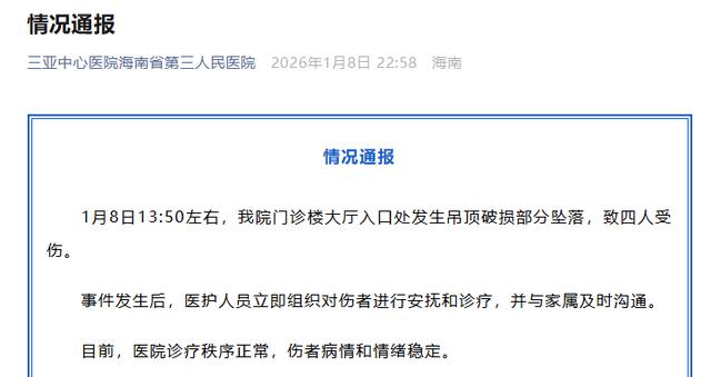 1月8日晚,三亚中心医院(海南省第三人民医院)发布情况通报称,该院门诊楼大厅入口处发生吊顶破损部分坠落,致4人受伤。目前伤者病情和情绪稳定。