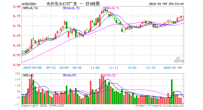 1月9日,光伏龙头ETF广发(560980)开盘跌0.67%,报0.744元。光伏龙头ETF广发(560980)重仓股方面,阳光电源开盘跌0.92%,特变电工跌0.08%,TCL科技涨0.00%,正泰电器涨0.24%,晶盛机电跌0.67%,德业股份跌0.26%,捷佳伟创跌1.11%,科华数据涨1.79%,锦浪科技涨0.21%,阿特斯跌1.81%。
