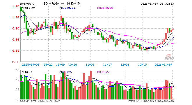 1月9日,软件龙头ETF(159899)开盘跌0.21%,报0.940元。软件龙头ETF(159899)重仓股方面,科大讯飞开盘跌0.49%,同花顺跌0.31%,金山办公跌0.16%,指南针跌1.00%,恒生电子跌0.06%,润和软件跌0.49%,三六零跌0.79%,拓维信息跌1.78%,用友网络跌0.72%。