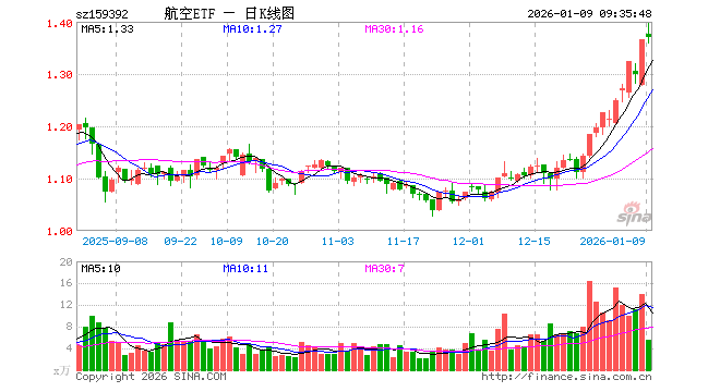 1月9日,航空ETF(159392)开盘涨0.88%,报1.377元。航空ETF(159392)重仓股方面,万丰奥威开盘涨0.73%,洪都航空涨2.59%,航天彩虹涨1.91%,中直股份涨0.24%,珠海冠宇涨0.28%,华力创通涨0.14%,应流股份涨2.00%,南网科技涨0.02%,睿创微纳涨0.12%,中国卫星涨1.75%。