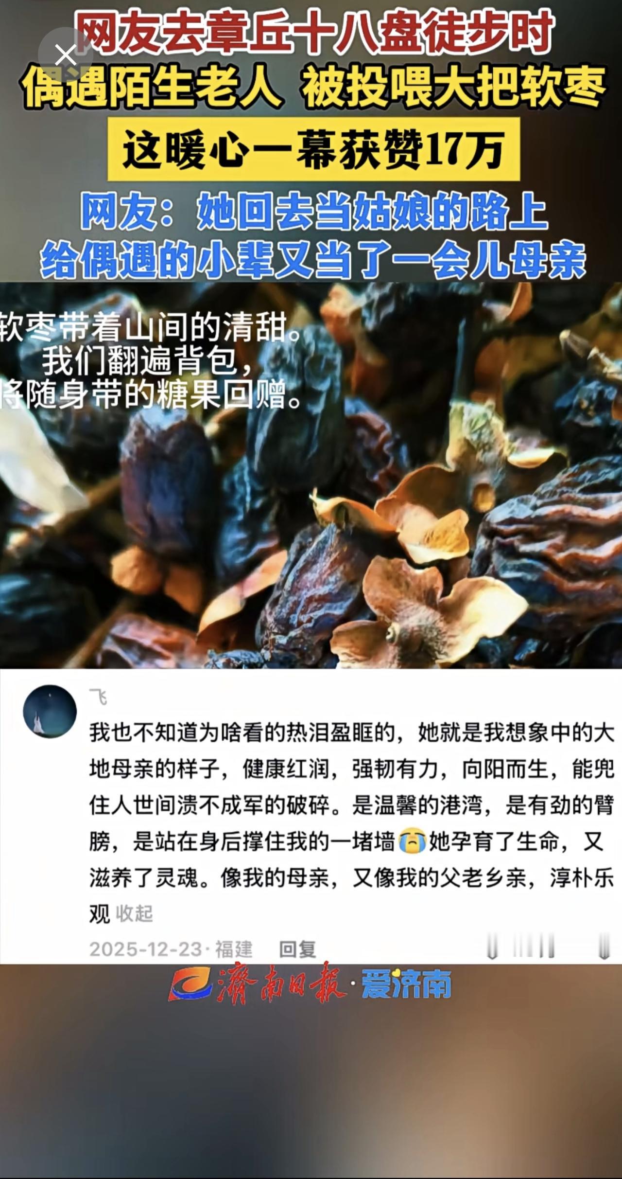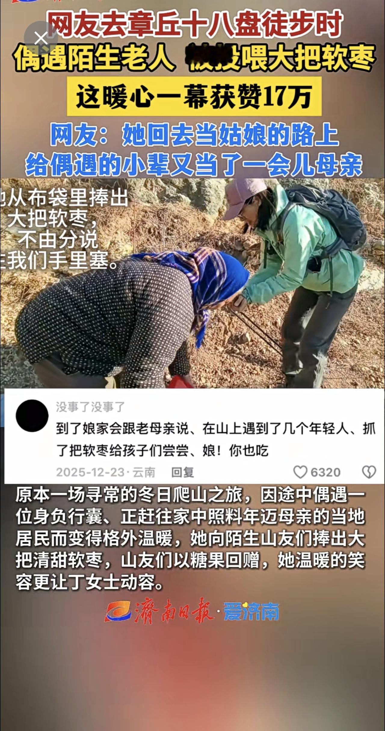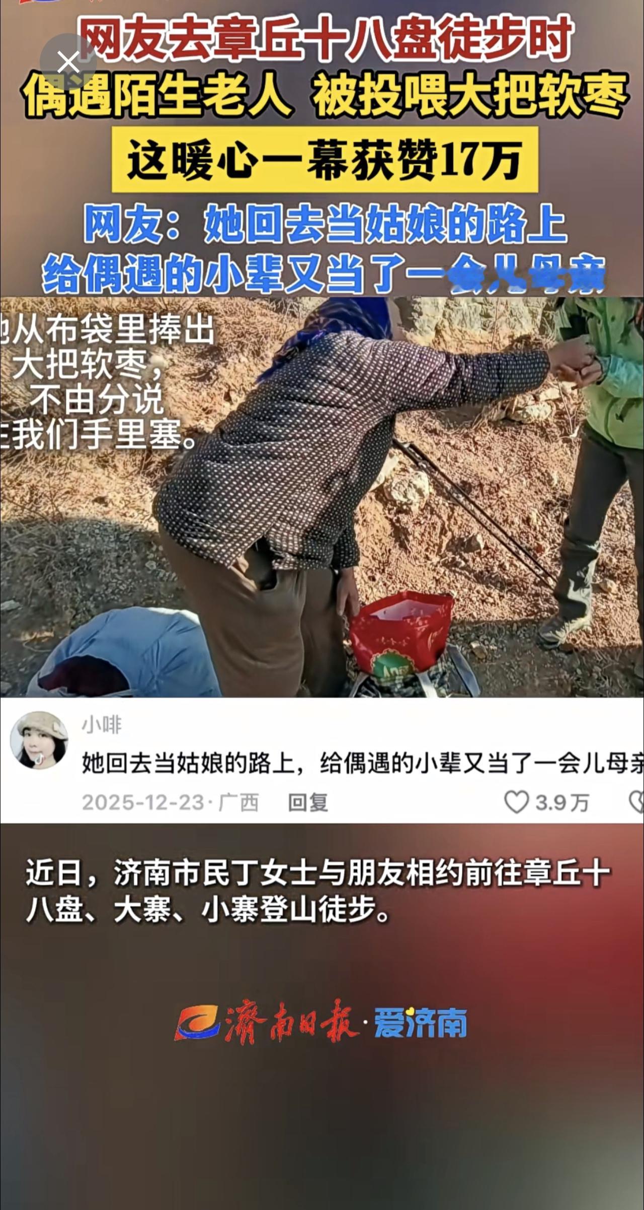 网友去章丘十八盘徒步时偶遇陌生老人,被投喂大把软枣,这暖心一幕获赞17万。暖心一