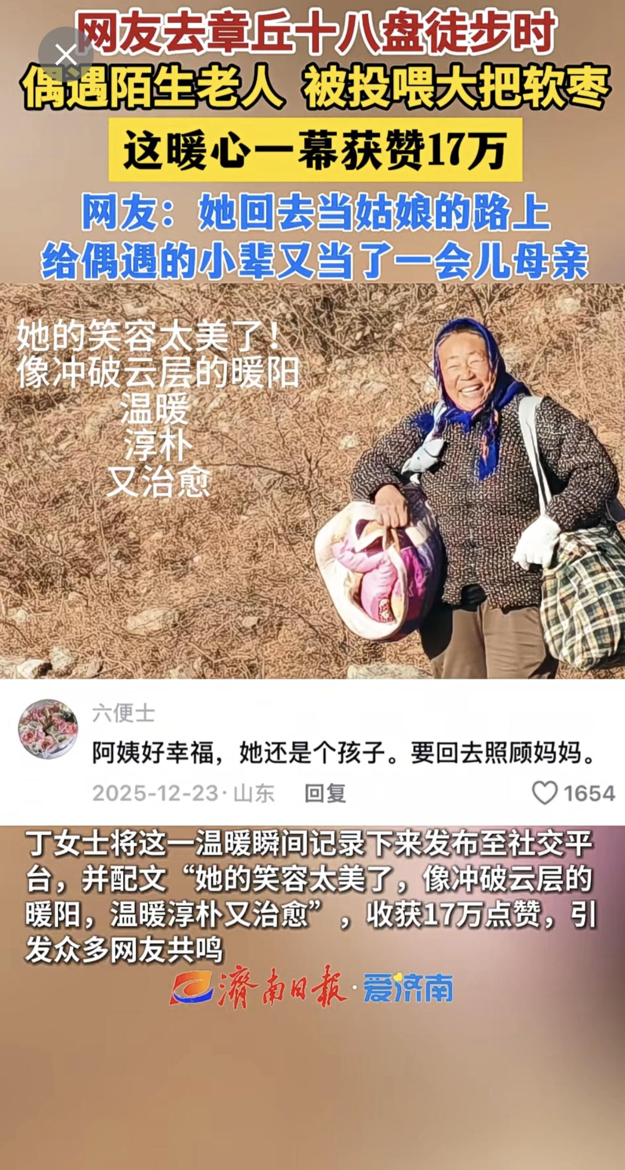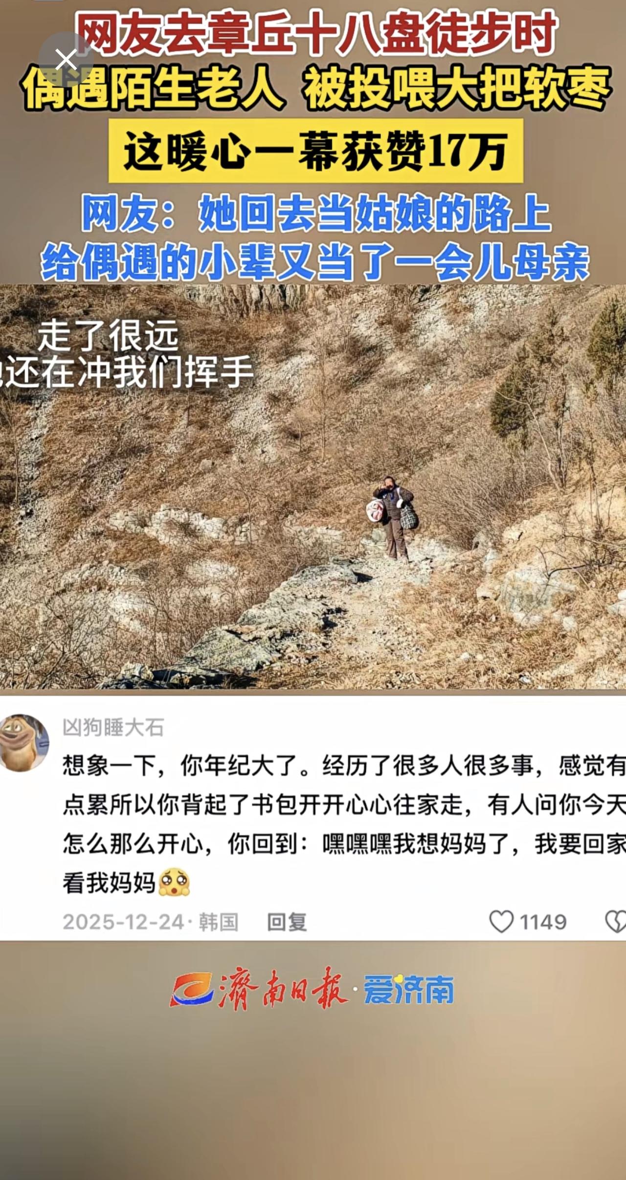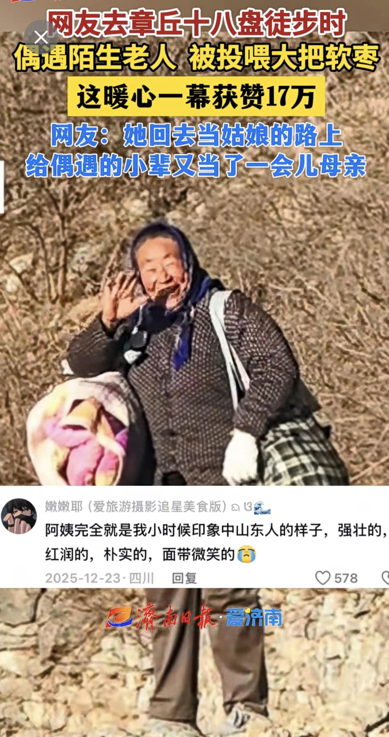 网友去章丘十八盘徒步时偶遇陌生老人,被投喂大把软枣,这暖心一幕获赞17万。暖心一