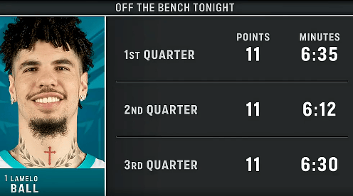 太稳定了!拉梅洛-鲍尔前三节都出战6分多钟,均砍下11分