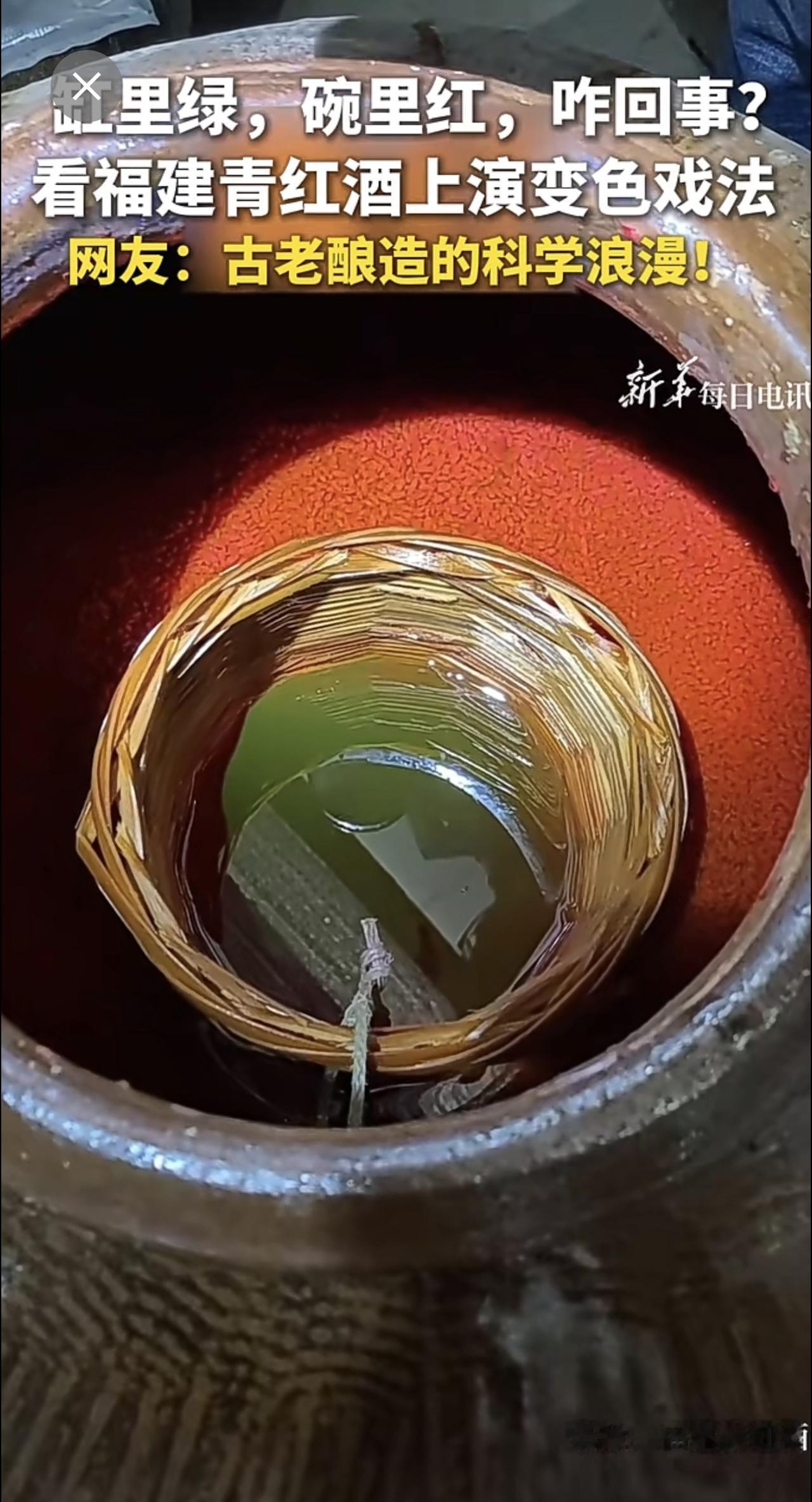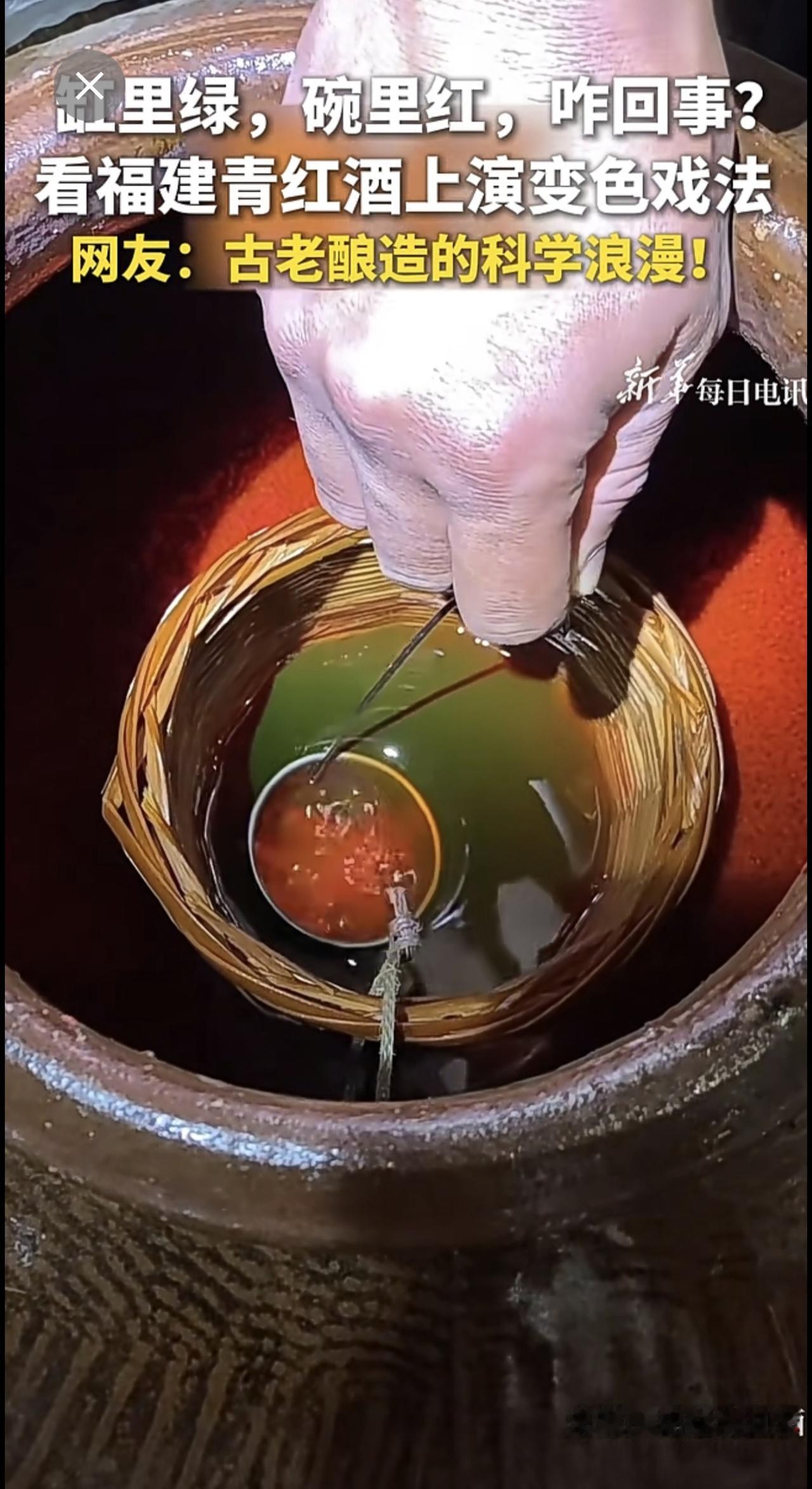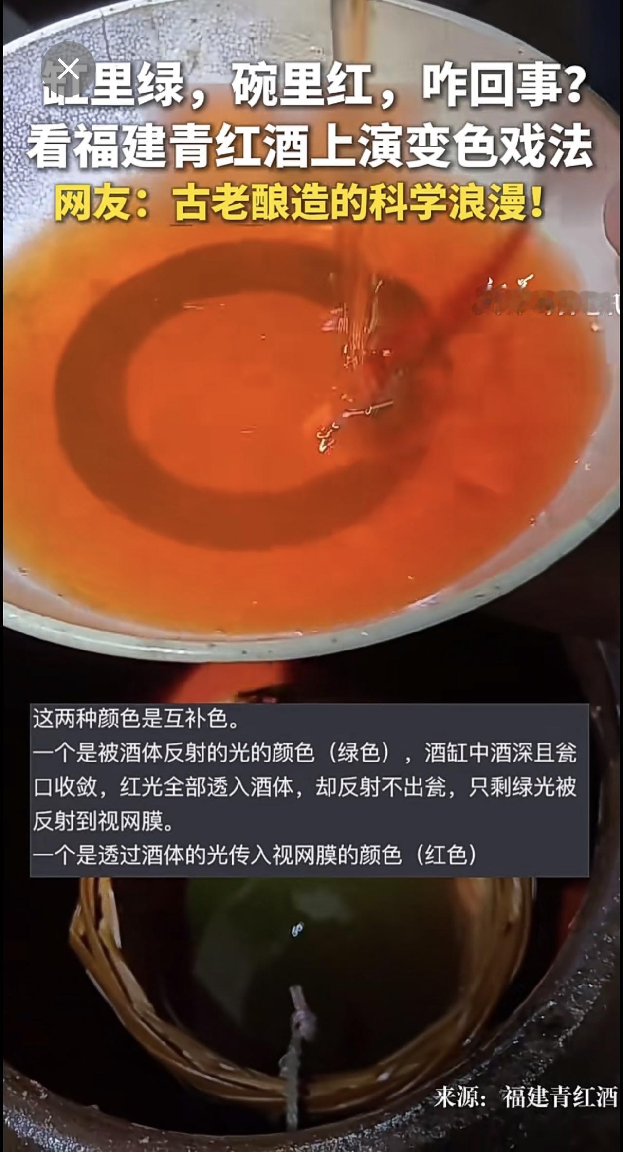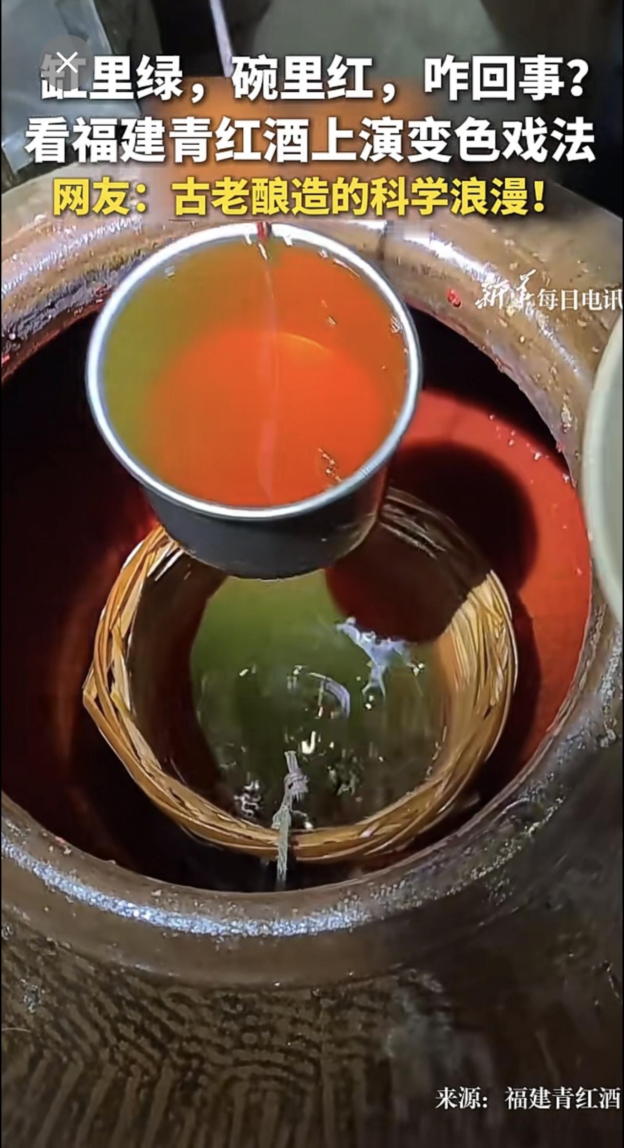 | 缸里绿,碗里红,咋回事?看福建青红酒上演变色戏法。网友:古老酿造的科学浪漫!