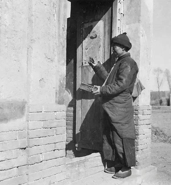 1933-1946年间,海达·莫里循镜头下,砖石砌成的门楼墙皮斑驳,木门上的门神画褪了色,眉眼轮廓还依稀能辨,门楣边的字迹半隐在阴影里。 穿厚棉袍的汉子裹得严实,棉袍边角磨出软褶,帽子压着额角,显是秋冬时节的冷。他侧身贴在门边,一只手轻抬着,指尖挨着门板似在轻叩,另一只手捧着是说唱用的竹板,姿态里带着讨生活的谦卑,像刚唱完一段词,正等门内人递来些许钱粮。