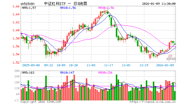 1月9日,截止午间收盘,中证红利ETF(515080)跌0.13%,报1.566元,成交额1.43亿元。中证红利ETF(515080)重仓股方面,宁波华翔截止午盘涨0.93%,中远海控跌0.07%,冀中能源涨0.55%,潞安环能跌0.15%,中谷物流跌0.20%,农业银行跌0.54%,南钢股份涨1.47%,海澜之家跌0.33%,建设银行跌1.10%,中信银行跌1.08%。