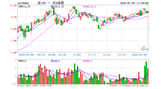 1月9日,截止午间收盘,深100ETF方正富邦(159961)涨0.23%,报2.141元,成交额818.28万元。深100ETF方正富邦(159961)重仓股方面,宁德时代截止午盘涨0.05%,美的集团涨0.67%,中际旭创跌1.66%,东方财富涨0.29%,新易盛跌2.23%,立讯精密涨1.07%,比亚迪涨0.35%,阳光电源跌0.70%,五粮液涨0.22%,格力电器跌0.10%。