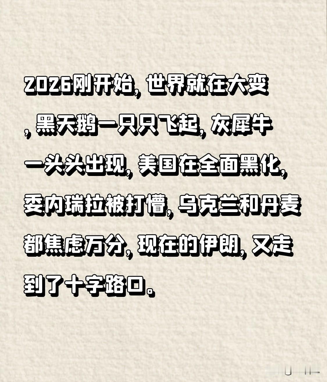 2026年伊始,世界便风云变幻,黑天鹅事件接连上演,灰犀牛危机频频涌现。美国愈发走向极端,委内瑞拉被打得措手不及,乌克兰和丹麦皆焦虑不已。如今,伊朗也站在了命运的十字路口。