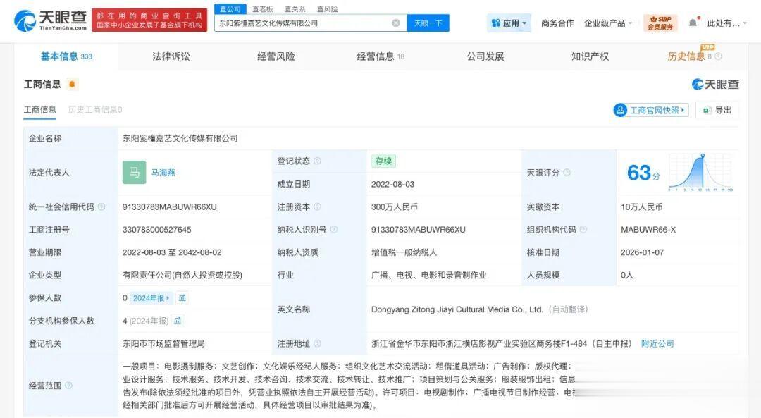 东阳紫橦嘉艺文化传媒有限公司成立于2022年8月,法定代表人为马海燕,注册资本300万人民币,经营范围含电影摄制服务、文化娱乐经纪人服务、组织文化艺术交流活动、租借道具活动、信息咨询服务、广播电视节目制作经营、电视剧发行等。股东信息显示,该公司现由杨紫、马海燕分别持股90%、10%。