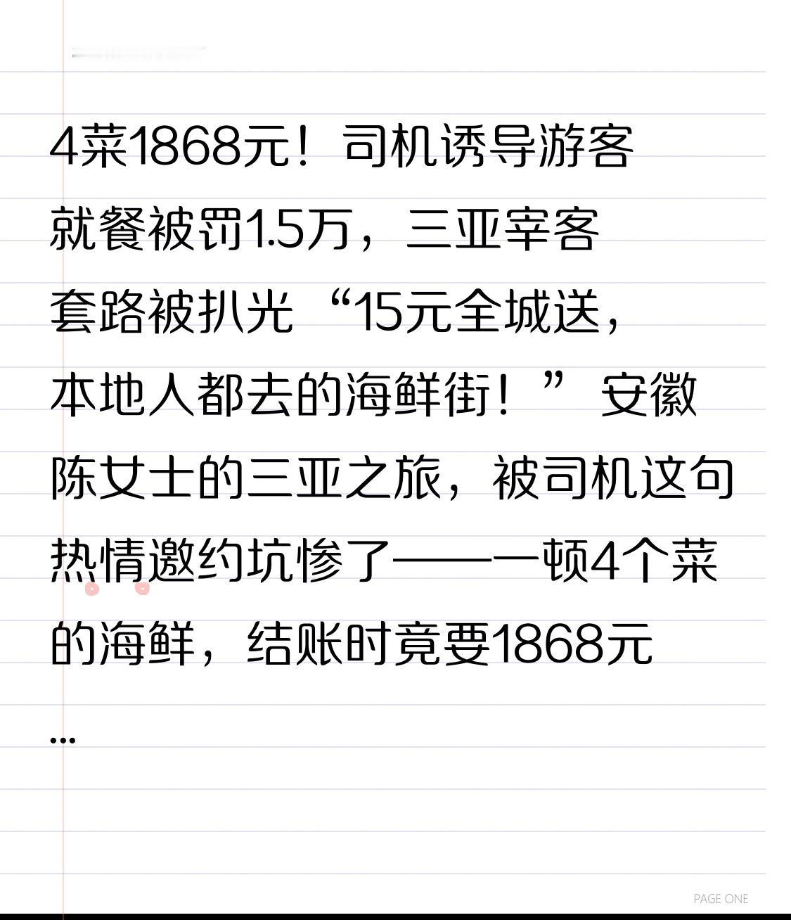4菜1868元!司机诱导游客就餐被罚1.5万,三亚宰客套路被扒光 “15元全城送,本地人都去的海鲜街!” 安徽陈女士的三亚之旅,被司机这句热情邀约坑惨了——一顿4个菜的海鲜,结账时竟要1868元,而近日官方通报的1.5万元罚单,让这场“天价消费”背后的套路彻底曝光! 2026年元旦刚过,陈女士带着80多岁的外公赴三亚旅游,在酒店门口被非运营车辆司机拦下。司机打着“下班顺路挣油钱”的旗号,用低价车费吸引他们上车,还极力贬低陈女士提前选好的海鲜店:“那家专坑外地人,海鲜都是冷冻的”。架不住司机的软磨硬泡,陈女士最终放弃原计划,被拉到40分钟车程外的“渔多多海鲜店”。 进店后更糟心的事接连发生:服务员不仅用“整个三亚都这价”“没钱别吃海鲜”施压,还趁他们不熟悉海鲜品种,偷偷更换菜品名称——点的皮皮虾变成1376元/公斤的“泰虾”,蚬子换成158元/公斤的“面包螺”。加上两个椰子,总消费高达1930元。直到后来逛三亚第一市场,陈女士才发现同款皮皮虾市场价仅260元/斤,涉事店铺定价足足高出两倍多。 转折点来得大快人心!陈女士投诉后,市场监管部门迅速介入调查。让人意外的是,调查显示商家明码标价符合规定,未发现价格违法行为,但司机诱导消费的证据确凿——其与海鲜店存在合作返利关系,通过虚假宣传、更改目的地等方式强制游客消费,已构成《侵害消费者权益行为处罚办法》中的欺骗性销售诱导。最终,涉事司机被处以1.5万元罚款,商家也退还了1000元不合理费用。 其实这不是孤例!网友们纷纷晒出同款遭遇:张家界游客被司机拉去吃2菜844元的“天价娃娃鱼”,西双版纳游客被推荐到偏僻餐厅花600元吃普通野菜。这套“司机拦客-贬低原选店铺-拉往合作黑店-商家抬价”的连环计,早已形成成熟产业链,司机能拿到消费额30%-50%的回扣。 更讽刺的是,涉事海鲜店根本不上线外卖平台,避开线上评价监督,专做“一锤子买卖”。而游客往往因为行程紧张、老人小孩经不起折腾,只能被迫买单。好在现在监管越来越严,三亚推出的物联网溯源电子秤、消费纠纷先行赔付等举措,让不少游客投诉后都成功维权,就像张先生投诉后不仅拿到退款,涉事司机还被重新培训。 这场天价海鲜风波,罚的是诱导消费的司机,敲醒的是所有旅游从业者。旅游城市的口碑不是靠虚假宣传堆出来的,而是靠诚信经营攒起来的。就像淄博烧烤靠明码标价、足斤足两成为诚信标杆,三亚想要留住游客,更该严查司机与商家的利益勾结,让“宰客套路”无处遁形。 出门旅游,你遇到过司机诱导消费吗?如果遭遇天价账单,你会选择忍气吞声还是坚决维权?欢迎在评论区分享你的经历。认同“旅游消费该明明白白”的,不妨点个赞,让更多人知道:合理定价是底线,诱导宰客必受罚!