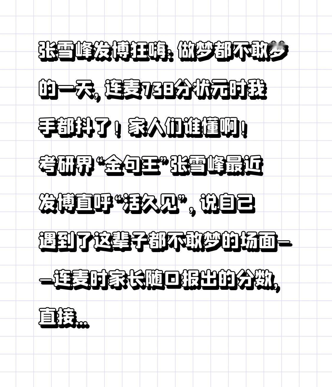 张雪峰发博狂嗨:做梦都不敢梦的一天,连麦738分状元时我手都抖了! 家人们谁懂啊!考研界“金句王”张雪峰最近发博直呼“活久见”,说自己遇到了这辈子都不敢梦的场面——连麦时家长随口报出的分数,直接让见过大世面的他当场失态,直播间手都抖了! 熟悉张雪峰的都知道,他这辈子阅“生”无数,从985学霸到逆袭学渣,什么样的考生没见过?可就在那天直播,一个连麦请求让他彻底破防。刚开始家长说“孩子模考735分”,张雪峰还笑着调侃:“大姐,吹牛也得有个谱,这分我做梦都不敢想!”结果下一秒家长补了句“刚出分,实际738.5,除了语文都满分”,直播间瞬间安静三秒,随后张雪峰拍着桌子狂喊:“这哪是考生啊,这是学神下凡!” 谁能想到,这个让他直呼“不敢梦”的场面,背后还有个反转。其实几天前这位家长就找过他,当时说孩子想报计算机专业,张雪峰还耐心拆解方向,压根没敢问分数。直到二次连麦家长主动爆料,他才知道自己居然在给内蒙状元级别的学霸做规划。更绝的是家长的神操作,直接开玩笑说“把女儿快递给你,635分就行”,逗得张雪峰直摆手:“这分我可不敢接,得供起来!” 要知道,张雪峰前阵子刚经历过账号禁言、舆论风波,多少人等着看他翻车。可他转头就用这场“梦幻连麦”圈粉无数,评论区全是“沾沾学神喜气”“张老师也有被拿捏的一天”。有人说他运气好,可只有老粉知道,这份“梦幻”藏着多少坚持——从北漂培训老师到千万粉名师,他见过太多考生因信息差走弯路,所以才拼尽全力拆解专业、分析就业,这份较真才让家长愿意把状元级孩子托付给他。 其实我们每个人的人生里,都有过“做梦都不敢梦”的时刻。可能是突然降临的机遇,可能是坚持多年的回报,就像张雪峰没想到自己能帮到顶尖学霸,就像我们没想到曾经的咬牙坚持,终会变成照亮前路的光。 你有没有过那种“不敢相信是真的”的高光时刻?是考上理想学校,还是遇到命中贵人?评论区聊聊你的“梦幻瞬间”,沾沾学神和张老师的好运,2026年咱们都能解锁意想不到的惊喜!