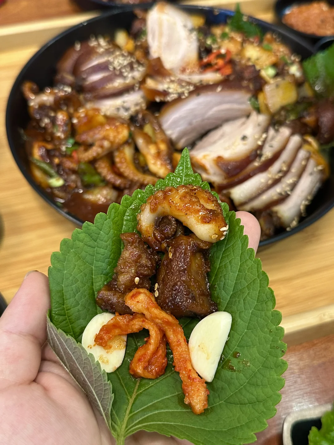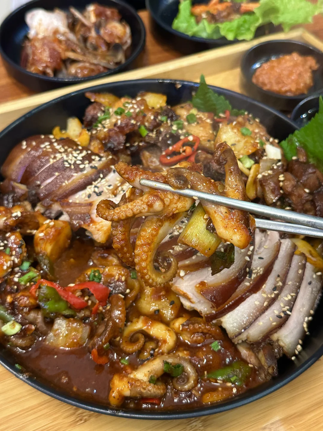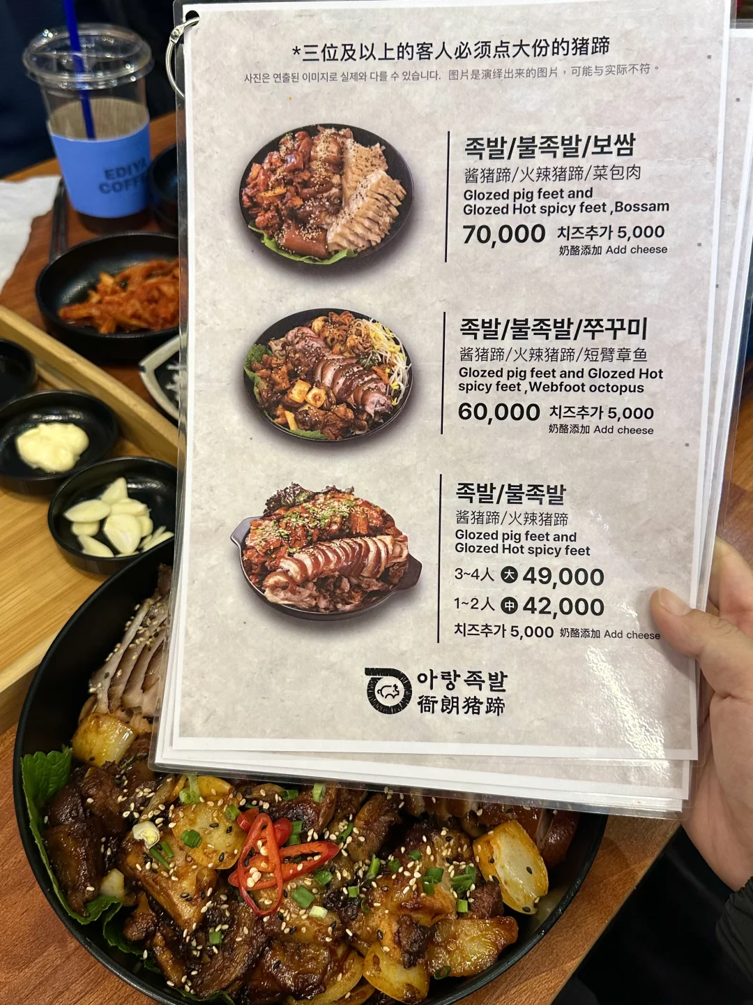 在我们酒店旁边(市区)真的很好吃啊!! 人均75分量真不小 辣猪蹄的话还挺辣的 章鱼猪蹄还挺创新 分量很多 菜单没几页 主要就是做猪蹄厉害 店名叫衙朗猪蹄