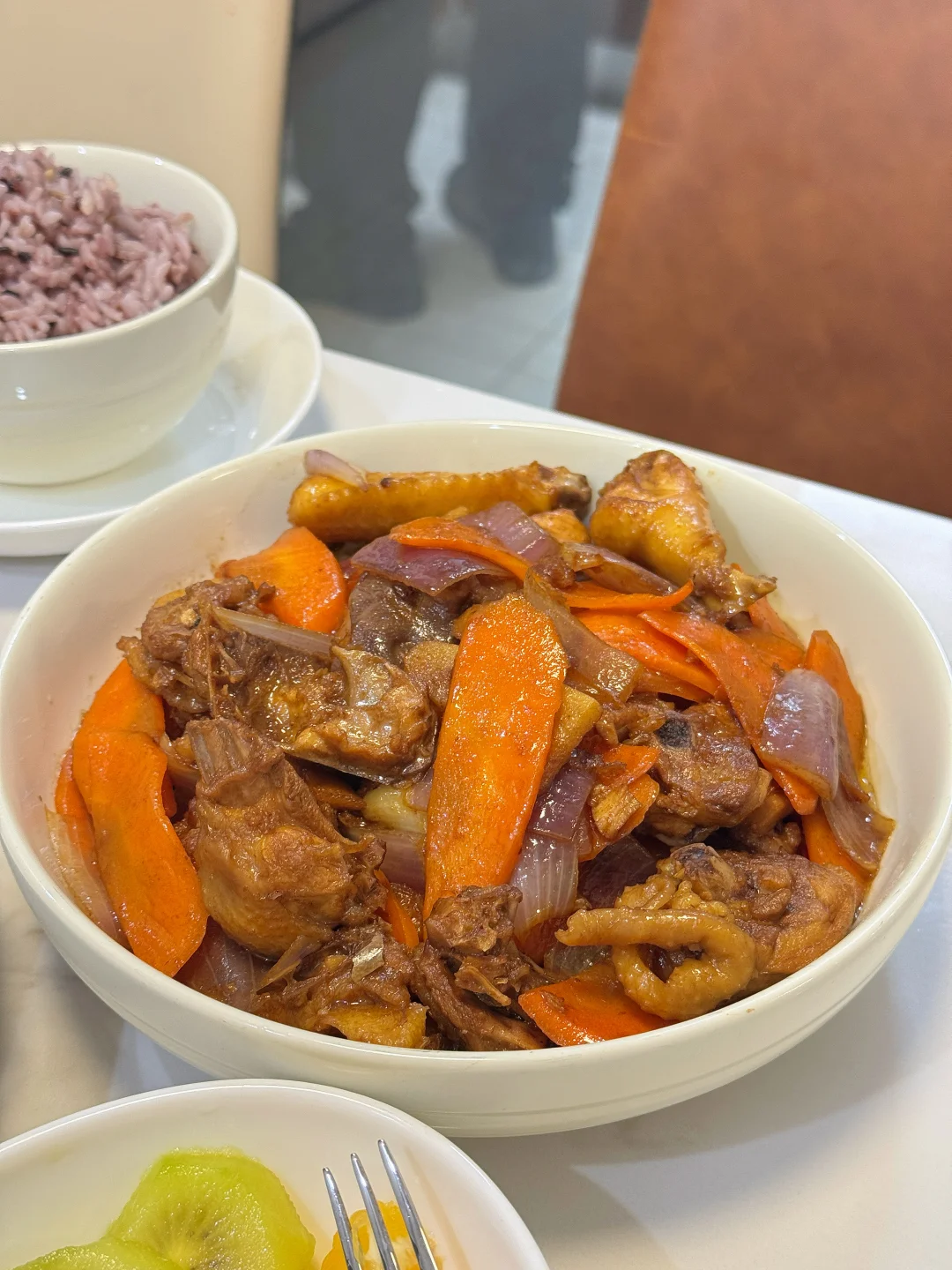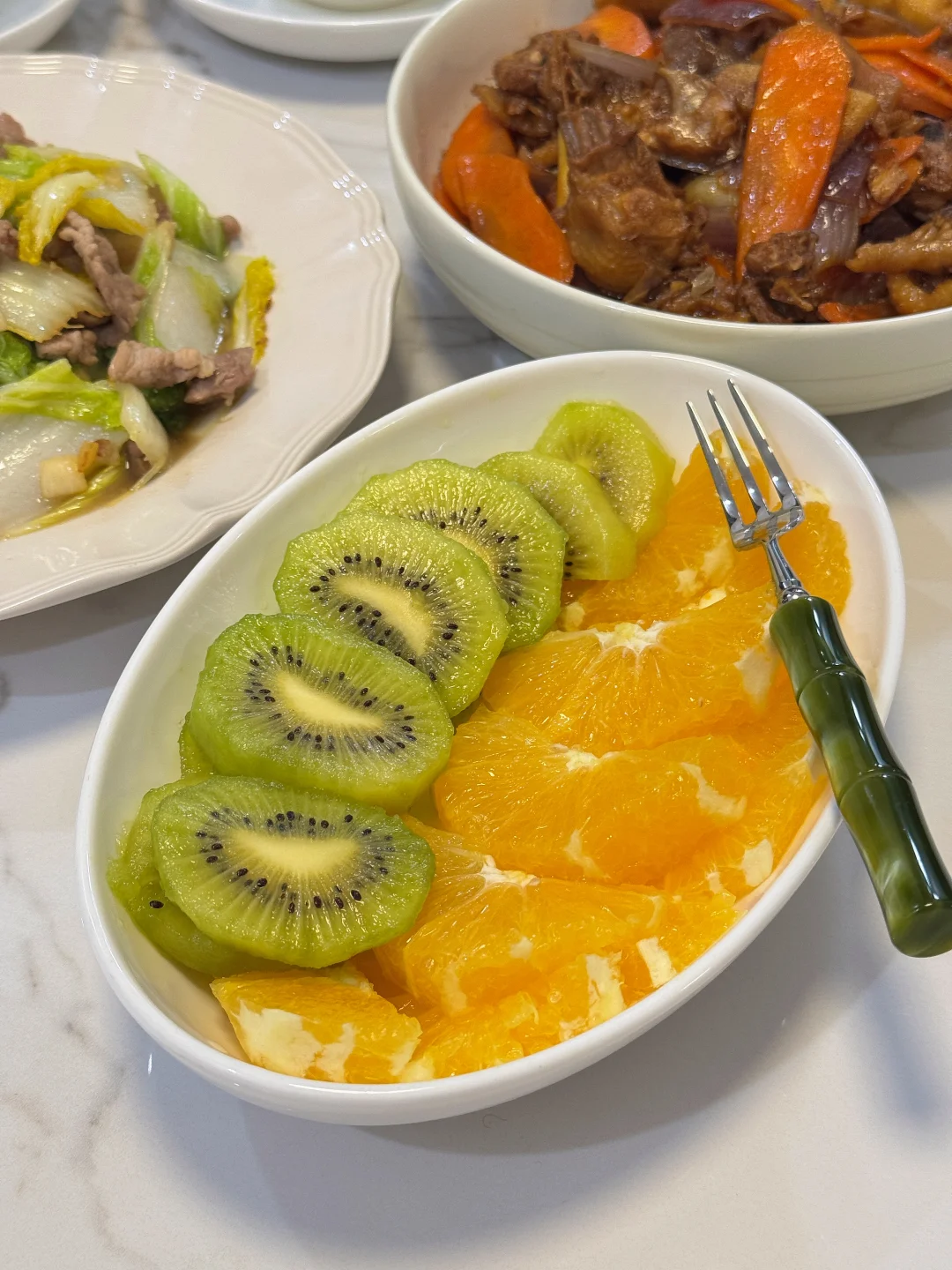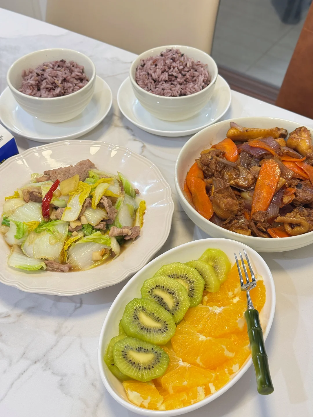 已婚小夫妻的晚餐 [郁金香R]胡萝卜洋葱炒土鸡 [郁金香R]猪肉炒大白菜 [红色心形R]餐后水果:猕猴桃🥝,橙子🍊 两个小菜加一小盘水果,配上杂粮米饭,吃得健康干净又满足[星R]