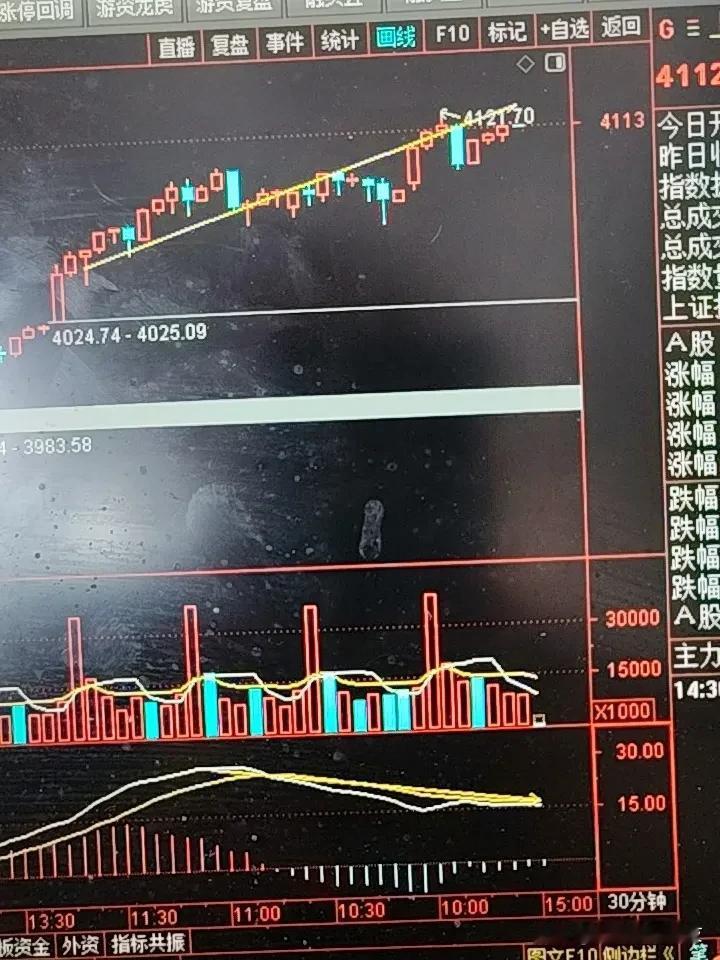 今天大盘再创新高突破4100点大关 量能也比昨天放大说明这个位置还是有大量资金参与,行业板块方面今天涨幅前三广告营销6.87%、 云服务6%、航天装备6.29%。领先概念板块还是商业航天、数据中心、人形机器人、AI医疗、广告营销。做短线就要看30分钟K线图,已经产生背离了。说明短线有可能回调30分钟K线图的60线。那些仓位比较重的股友还是可以减一些仓为。今天我也买入一只广告营销概念票早晨看到资金进场明显并且回调还是不断吸筹所以果断上车。不知道有多少人和我同车,来信息讨论一下。