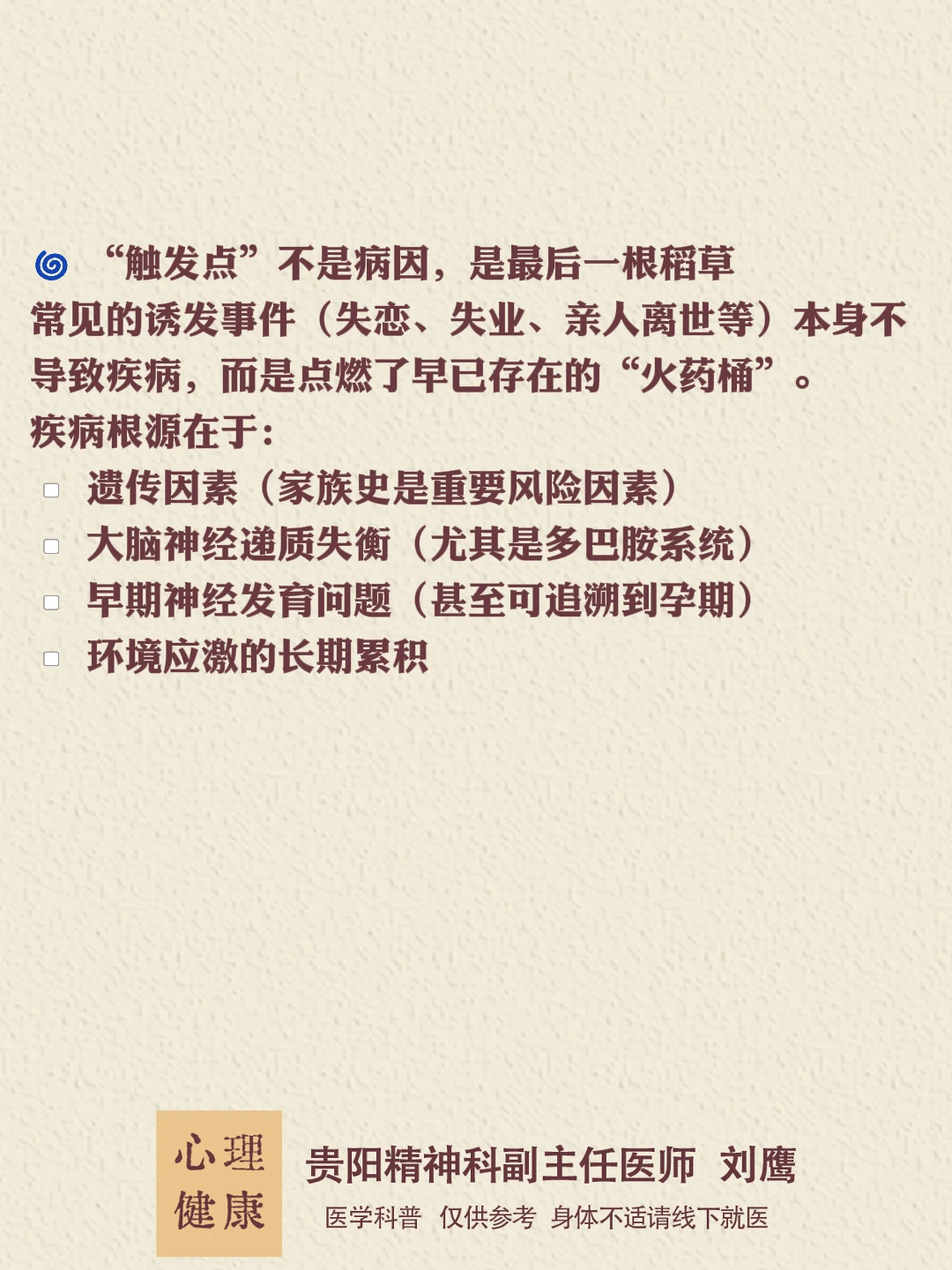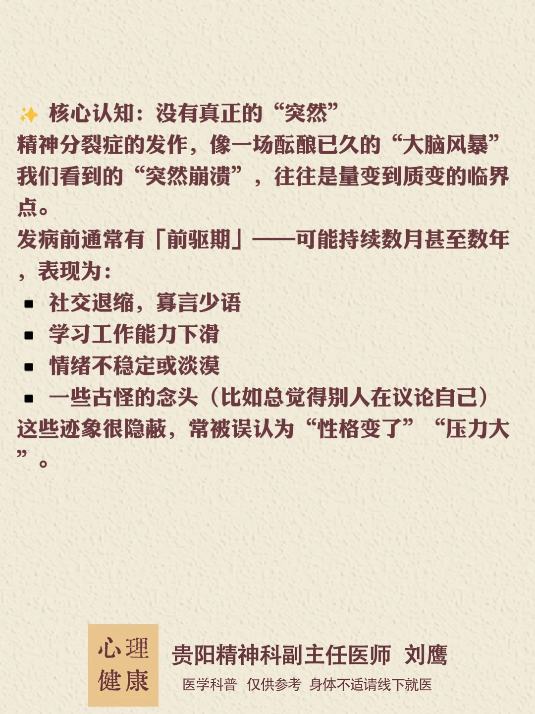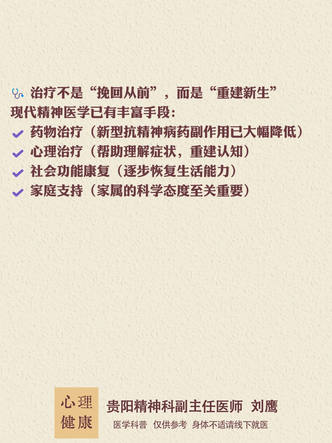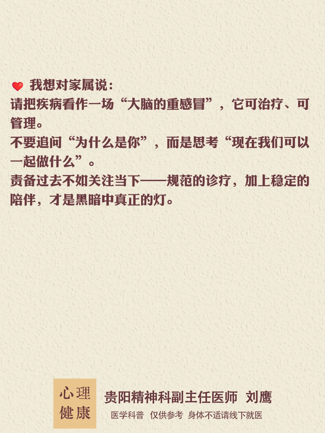 精神健康与身体健康同等重要。 如果你发现自己或亲友持续情绪异常、认知变化,请像对待持续发烧一样认真——尽早寻求评估。 不忽视、不恐惧、不污名化,是我们能给予彼此最温柔的善意。