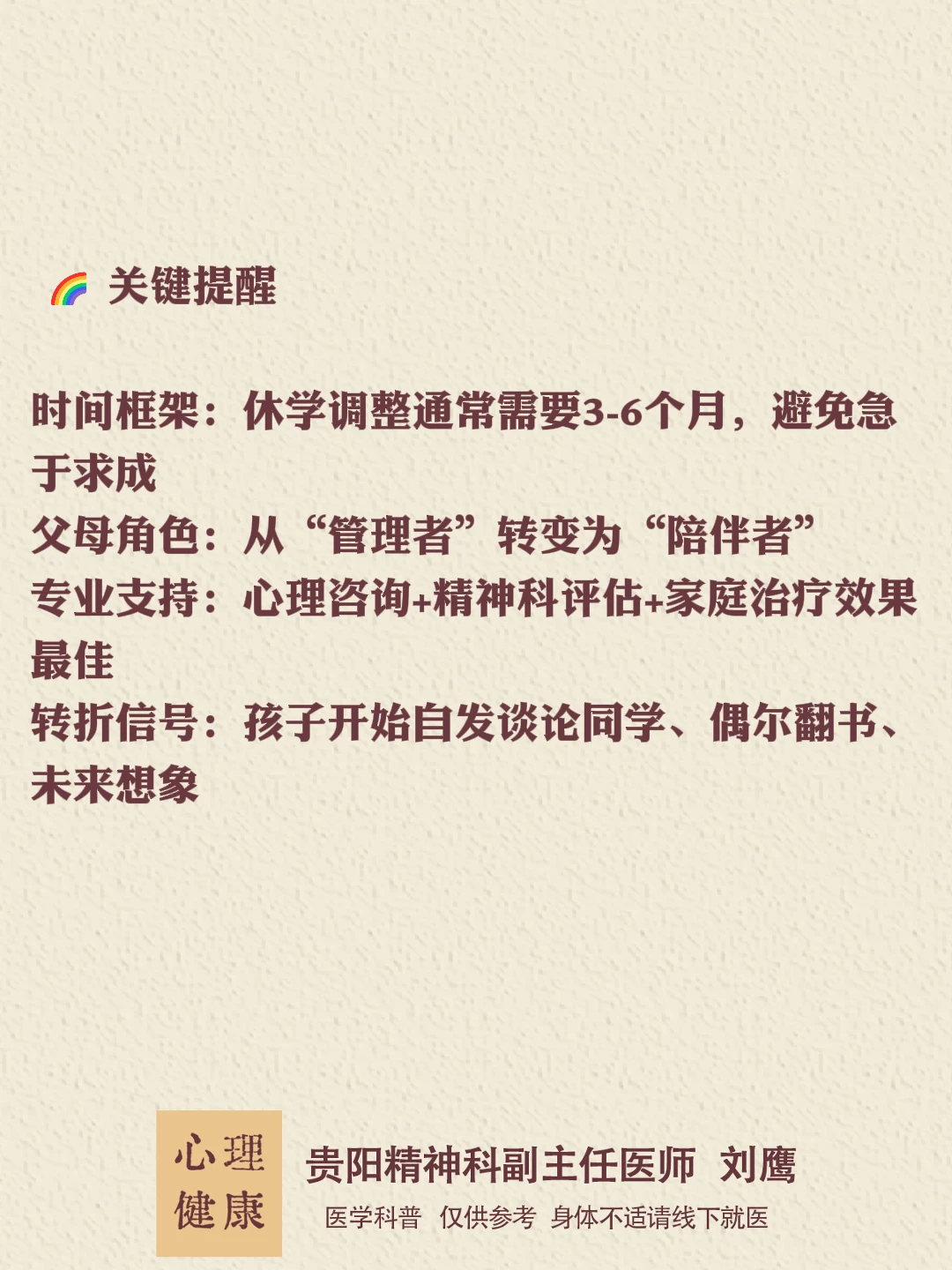 孩子的厌学,往往是心灵在呼救。 修复的不是“上学”这个行为,而是背后的心理生态系统。 每个孩子都有自己的时序, 耐心不是等待,而是带着信任的陪伴。