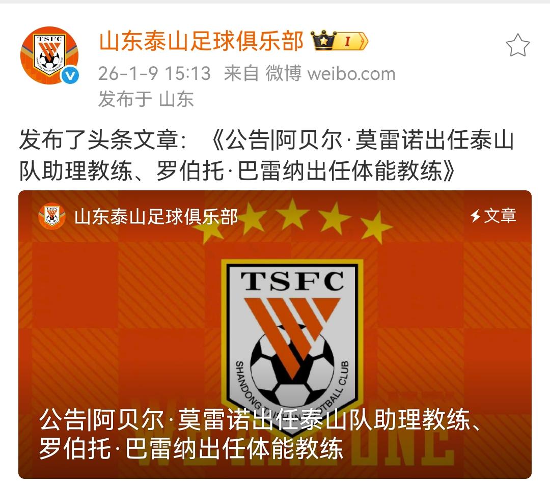 山东泰山队今天发布公告:阿贝尔·莫雷诺出任泰山队助理教练、罗伯托·巴雷纳出任体能教练。 韩鹏作为泰山队的主教练和教练组组长带队欢迎两位助教的到来。 西班牙籍教练阿贝尔·莫雷诺(Abel Mourelo)正式出任山东泰山一线队助理教练,西班牙籍教练罗伯托·巴雷纳(Roberto Barrena)正式出任山东泰山一线队体能教练。 阿贝尔·莫雷诺出生于1974年10月19日,拥有超过十年职业球队技战术助理教练经验,先后任职于塔拉戈纳、蔚山现代、奥林匹亚科斯、拉科鲁尼亚、仁川联等俱乐部,还曾担任西班牙女子国家队技战术助理教练。 罗伯托·巴雷纳出生于1988年9月17日,拥有丰富的足球体能训练经验,先后担任过奥萨苏纳俱乐部U19青年队及二线队体能教练,之后出任南美劲旅厄瓜多尔基多体育俱乐部一线队体能教练,助力球队打进南美解放者杯决赛。 现在有球迷说不该续约瓦科,别看现在有些说不该续约瓦科,只是支持瓦科续约的沉默了而已说,一旦不续,拿到中超MVP的瓦科,面对的质疑会成倍增加。 像这种估计一年现场都不怎么去的喷子,也别整天抱怨了,球队运营也有相应的规则,球迷再操心俱乐部也不会因为球迷说了啥就去做啥。所以安心看球,能看就看。 球队的内援就别考虑了,没有合适的国内球员,我们有青训,目前泰山队的5个外援16号归队,确定要引进一名外援中卫,感觉马德鲁加就凑活用吧,换一个也不一定强到哪去,中后卫肯定换,换个黑又硬,就看昨天云南玉昆官宣的那个黑又硬前锋,能把洛佩斯撞飞好几米。