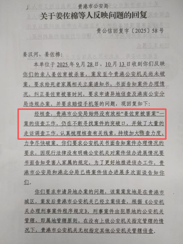 多年来,家人多次向公安机关追问进展。2025年10月27日,贵港市公安局回复称,从未放松对该案的侦查,持续开展走访调查,梳理核查线索,力求尽快破案。