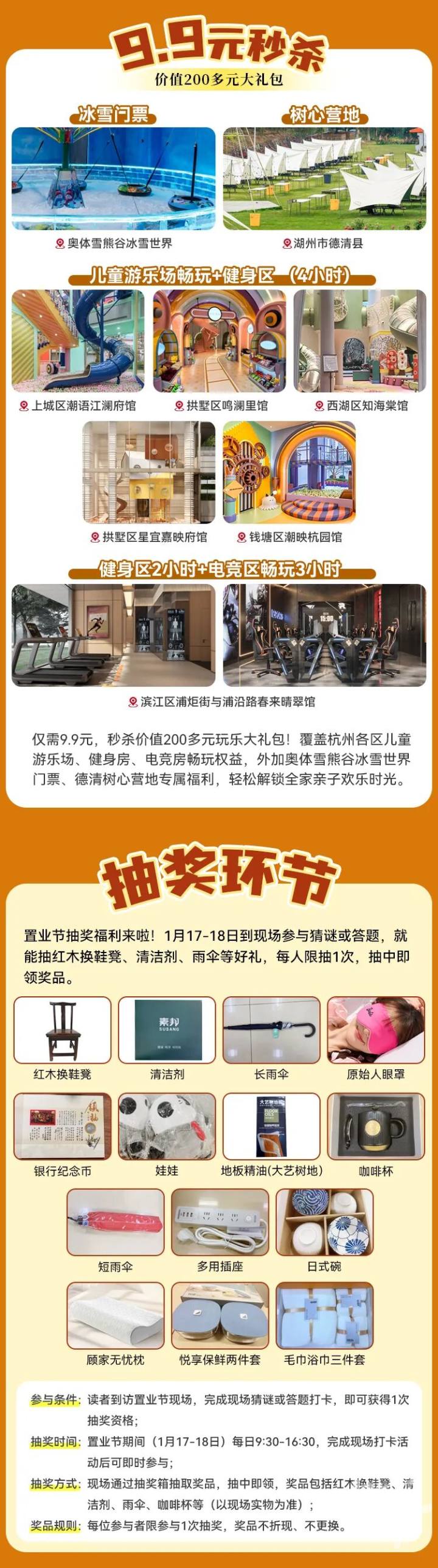 本次置业节福利多多,比如推出9.9元秒杀价值超200元大礼包活动,包含杭州奥体雪熊谷冰雪世界门票、德清树心营地门票及多个项目的童玩区、健身区入场券,扫描本版二维码购买即可锁定福利,并至现场兑换大礼包。