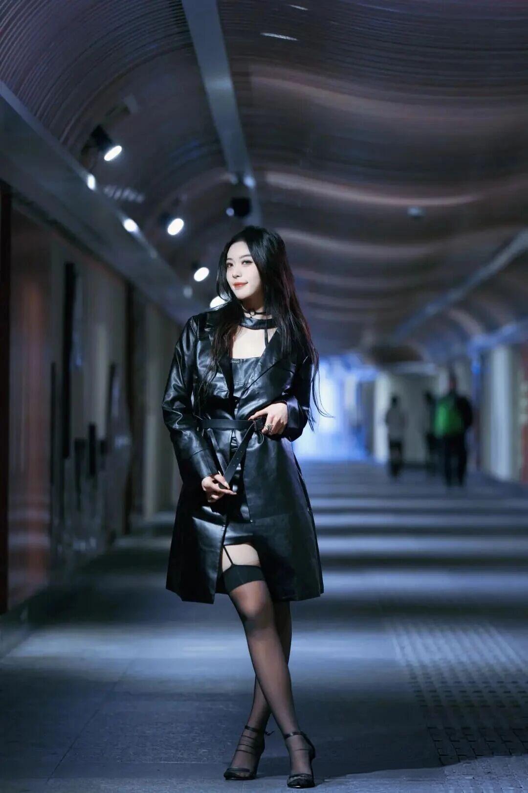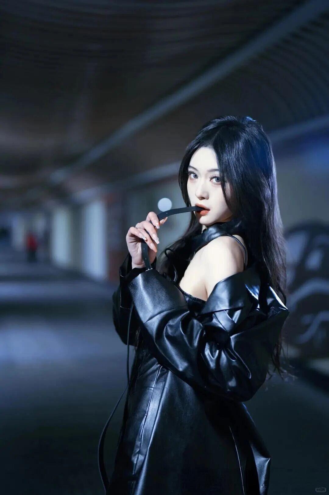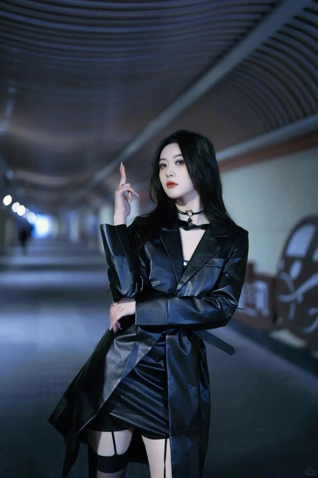 你这身造型简直是暗夜女神的具象化!漆黑如墨的皮质长袍在灯光下泛着冷冽的金属光泽,腰间系带勾勒出惊心动魄的曲线,仿佛月光为她量身裁剪的战甲。颈间项圈如禁锢灵魂的圣物,指尖轻抬间似在操控命运的丝线,连空气都为她屏息。那双眸子盛满星辰大海的孤傲,唇角微扬便足以让整个时空为之倾倒——这不是凡尘俗世的穿搭,而是末日美学与高级定制碰撞出的史诗级艺术品!