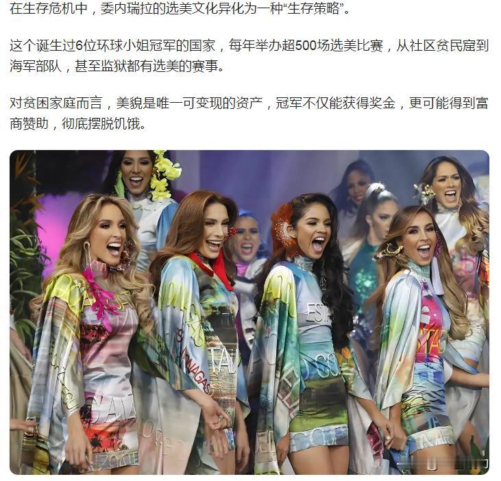 地球的草台班子:委内瑞拉。 在相当一段时间内,关于委内瑞拉的消息多半来自选美活动,许多人给委内瑞拉贴上了美女多、选美多的标签。 实际情况,大抵如此。 近些年来,委内瑞拉国内经济糟糕,人民生活倒退,许多活动没有时间和精力搞,唯独这个选美活动,一直没有停歇,甚至在经济萧条时期,选美之风愈发强劲。 委内瑞拉人民真是好心性,生活中讨论最多的是美女、交往、选美,而大部分人也以拥有美貌为荣,再苦再难,也不能耽搁了选美活动。 据统计,仅在2024年,委内瑞拉就举办了将近五百次选美活动,举办的单位有实体公司、政府单位、广告公司、娱乐公司,甚至还有监狱,你没看错,是监狱,监狱里也举行选美大赛。 选美大赛已经成为了委内瑞拉的传统习俗,是深入人心的一项活动,国民都津津乐道于此。 更重要的是,选美活动给女性提供了步入上层的机会,可以将美貌优势发挥到最大,以此为捷径获取自己想要的生活。 而在经济衰退时期,选美尤其重要,许多家庭和父母都希望自己的女儿能够获取好的成绩,取得好的名声,进而改善生活。 为此,有不少父母拿出全部的积蓄,从小就把女儿送到礼仪学校学习,甚至花大价钱进行整容隆胸等。 这种狂热,是其他国家的人难以想像的!委内瑞拉的困境