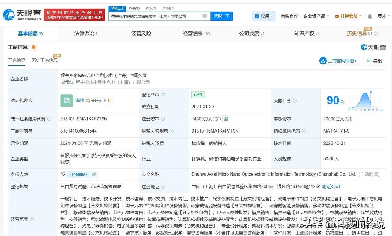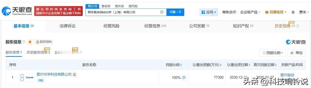【歌尔光学接手舜宇奥来微纳光学公司 歌尔光学再接手舜宇光学旗下一公司】 天眼查工商信息显示,近日,舜宇奥来微纳光学(上海)有限公司发生工商变更,原股东舜宇光学旗下宁波舜宇奥来技术有限公司、宁波舜奥自有资金投资合伙企业(有限合伙)、宁波舜承自有资金投资合伙企业(有限合伙)退出,新增歌尔光学科技有限公司为全资股东,叶辽宁卸任法定代表人,由饶轶接任,同时,部分主要人员发生变更。 舜宇奥来微纳光学(上海)有限公司成立于2022年12月,注册资本7.73亿人民币,经营范围包括光学仪器制造、光学玻璃制造、光学仪器销售等。值得一提的是,此前,舜宇奥来微纳光电信息技术(上海)有限公司发生工商变更,原股东宁波舜宇奥来技术有限公司退出,新增歌尔光学科技有限公司为全资股东。 天眼查信息: