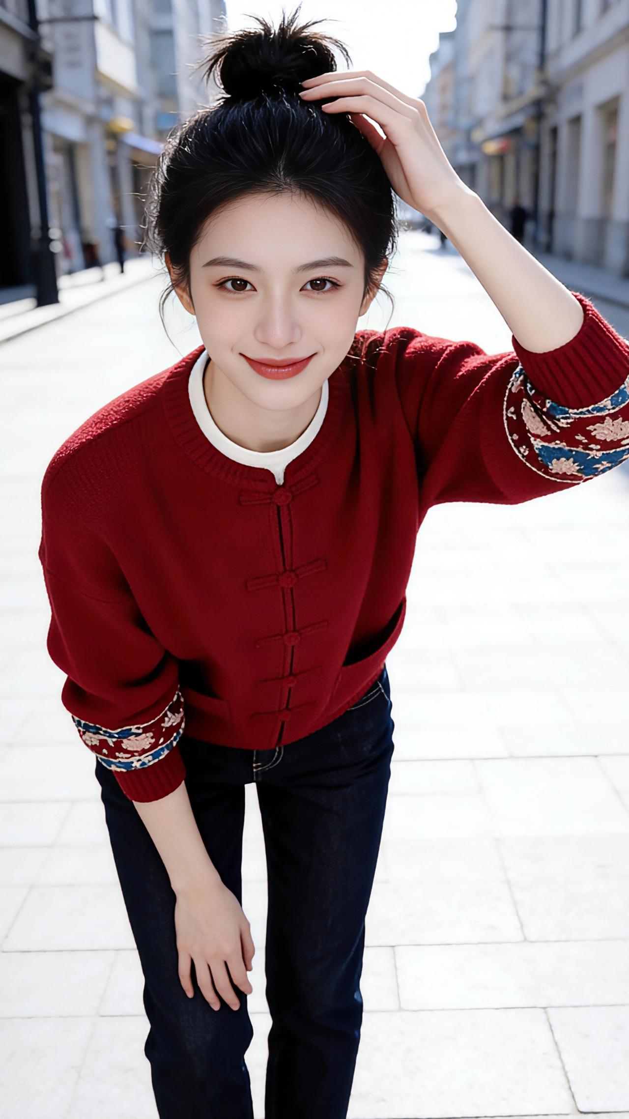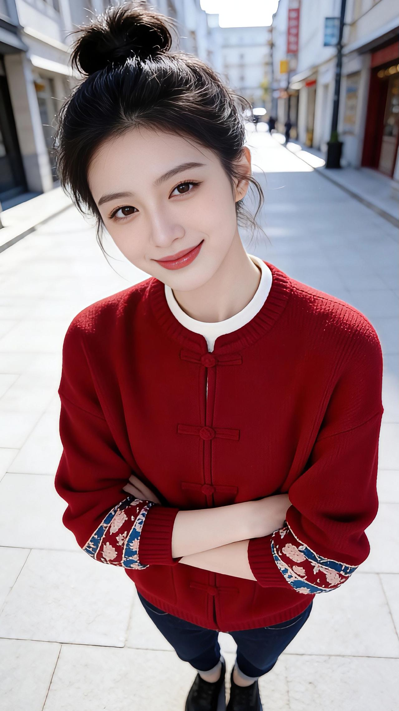 红衫行巷 暖阳揉碎在欧式街巷的石砖上,铺出一路温柔的金。20岁的她立在光影里,黑色蓬松丸子头松松挽着,几缕碎发被风拂得轻扬,冷白皮在日光下衬得愈发清透,精致的妆容勾勒出眉眼的灵秀,像从画里走出来的东方少女。 身上的酒红中式针织开衫是点睛的笔,盘扣顺着领口垂落,似古巷里系着的红绳,缠了几分东方的温婉。袖口的刺绣纹样藏着巧思,红蓝的绣线缠出繁花模样,在红色衣料上绽成一抹雅致。内搭的白边从领口探出,像雪落红梅的留白,下搭的深色牛仔裤又揉进了街头的随性,让中式的温婉与西式的洒脱撞了个满怀。 她抬手拢了拢丸子头,指尖轻触发梢的瞬间,唇角弯起的笑意漫开,像春日融了冰的溪。迈步走时,红衫在身侧轻轻晃,衣摆扫过石砖的纹路,脚下的光影随着步履流转,欧式建筑的廊柱成了背景,却衬得那抹红愈发鲜活——是东方韵致撞进异域街巷,是传统与新潮的温柔相拥,一步一行,都成了巷子里最动人的风景。 休闲穿搭 时尚穿搭 新年穿搭 新中式穿搭