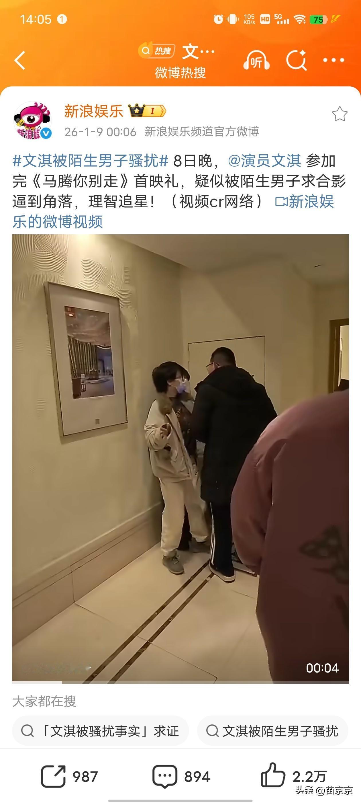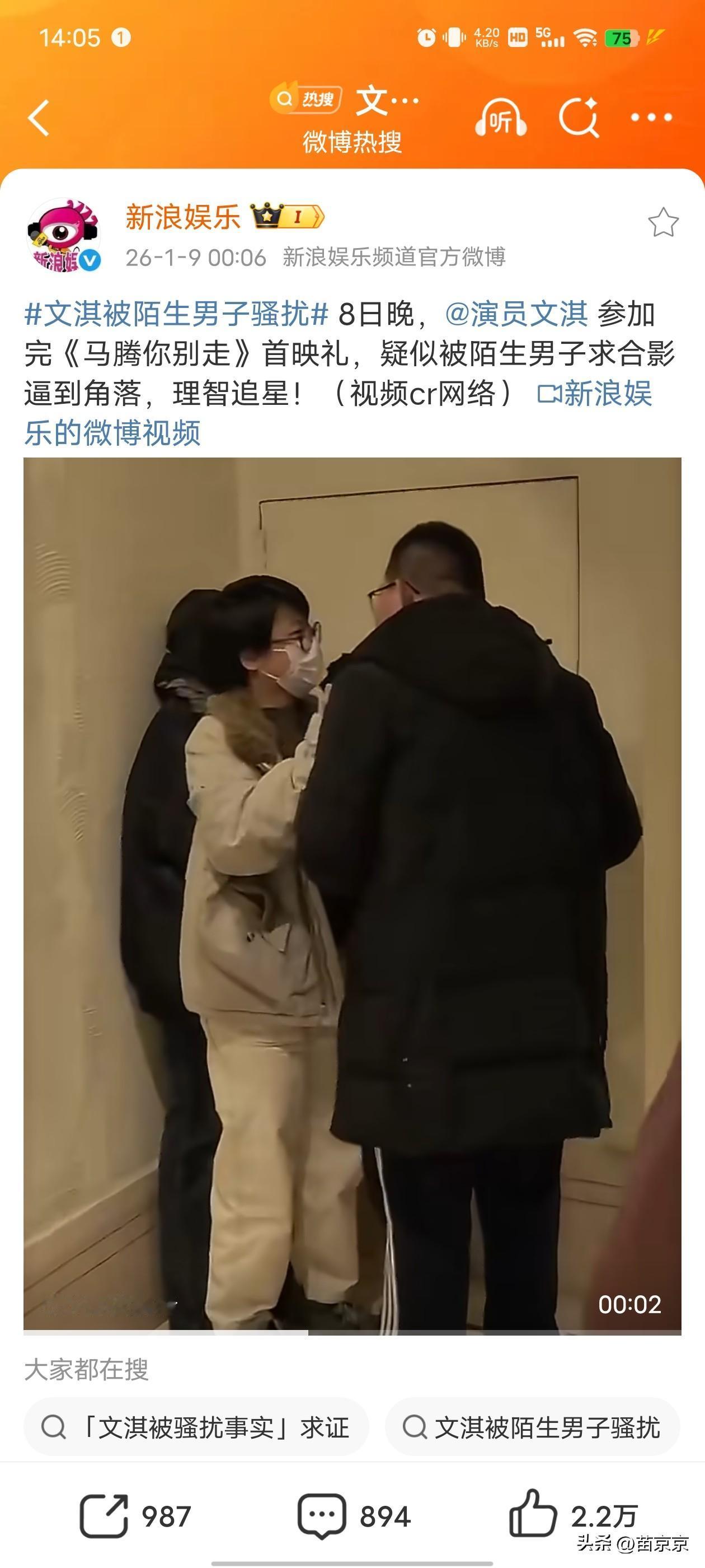 文淇遇可怕骚扰!惯犯堵路谩骂,这不是追星是犯罪! 太让人气愤了!演员文淇昨晚参加完电影首映礼,竟被一个陌生男人堵住骚扰。 视频里看得清清楚楚,那人把她逼到墙角非要合影,嘴里还不干不净地骂人,行为极其嚣张。 更可气的是,这男的压根不是粉丝,而是个专盯艺人的职业惯犯,纯粹为了博热度搞事情。 这种恶意骚扰的行径,早就超出了追星的底线,根本就是扰乱公共秩序。