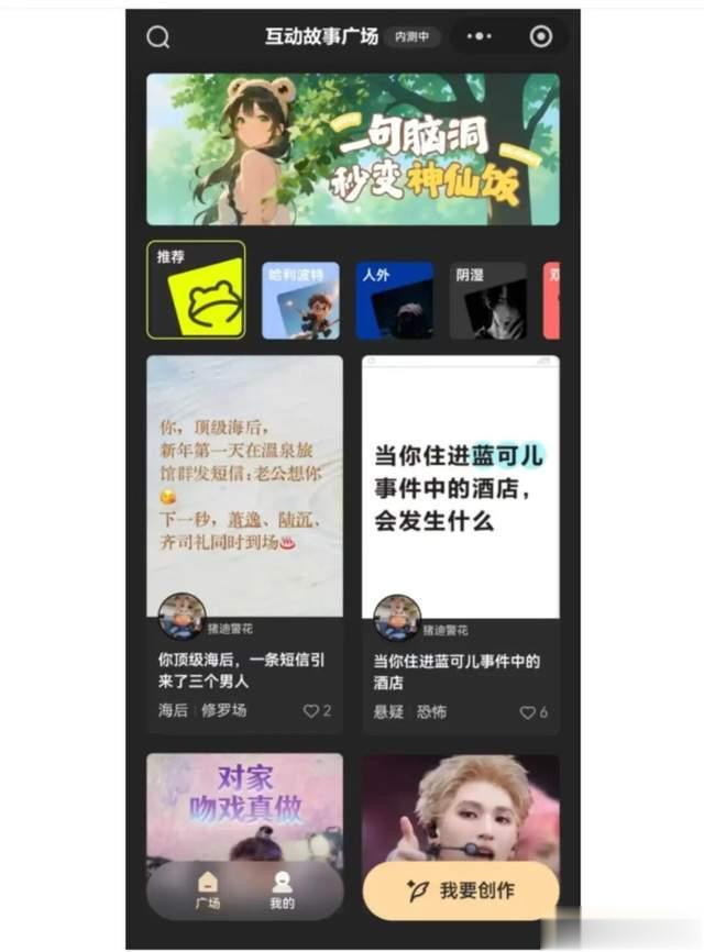 从网友曝光的图片可以看出,“上头蛙”聚焦互动故事创作与分享,打造了专属的“互动故事广场”。产品界面中呈现了丰富的故事主题分类与脑洞内容,涵盖“人外”“哈利波特”等热门IP相关题材,同时不乏“悬疑恐怖”等强情节、高话题度的故事方向。