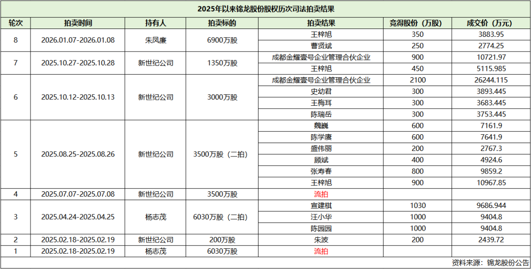 本次拍卖涉及股份占朱凤廉所持股份的52.23%,占公司总股本的7.70%。据锦龙股份2025年度三季报及过往拍卖记录,王梓旭此前已通过司法拍卖累计购入1350万股,此次竞得股份完成过户后,其持股将增至1700万股,预计将成为公司第六大股东。