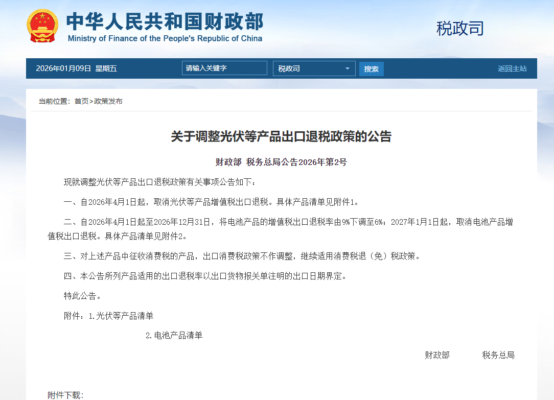 上证报中国证券网讯据财政部1月9日消息,财政部、税务总局发布关于调整光伏等产品出口退税政策的公告:自2026年4月1日起,取消光伏等产品增值税出口退税。自2026年4月1日起至2026年12月31日,将电池产品的增值税出口退税率由9%下调至6%;2027年1月1日起,取消电池产品增值税出口退税。对上述产品中征收消费税的产品,出口消费税政策不作调整,继续适用消费税退(免)税政策。本公告所列产品适用的出口退税率以出口货物报关单注明的出口日期界定。