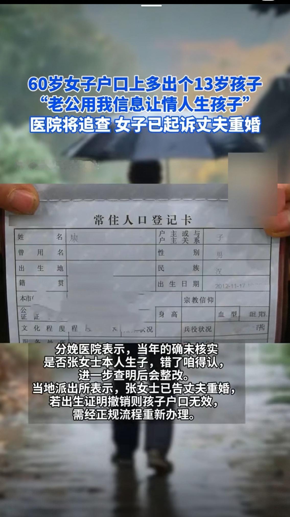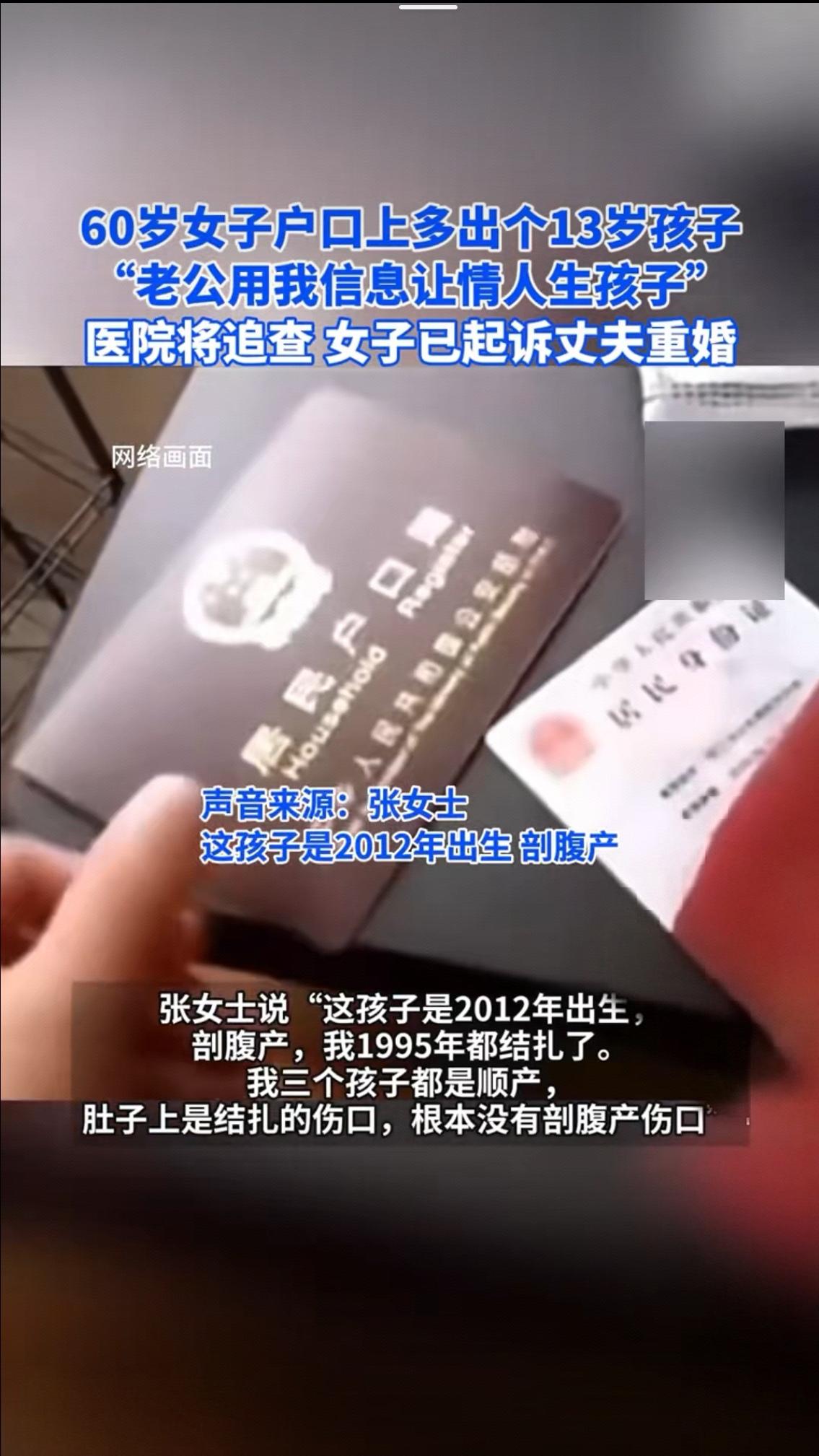 60岁女子结扎30年,名下突现13岁儿子!丈夫一句话,撕开婚姻最丑陋的真相 “我1995年就做了绝育手术,肚子上连剖腹产疤痕都没有,怎么可能2012年生个孩子?”河南洛阳60岁的张女士拿着刚补办的户口本,手止不住地发抖。这本记录着她与丈夫35年婚姻的户口本上,凭空多出一个13岁男孩,而她的名字,赫然写在“母亲”一栏。 谁能想到,这场荒诞剧的幕后黑手,竟是与她同床共枕三十余年的丈夫。随着张女士的追查,一个隐瞒了13年的骗局浮出水面:她火速赶往孩子出生的新安县第二人民医院调取病历,产妇姓名、身份证号全是她的信息,联系人却清清楚楚登记着丈夫的名字。面对铁证,丈夫终于坦白——这是他与婚外情人所生的孩子,为了给孩子落户,他偷偷拿走张女士的身份证,伪造了全套生育信息。 更令人心寒的是丈夫的态度。面对妻子的崩溃,他没有丝毫愧疚,反而理直气壮地辩解:“我不跟你说情况,你会给我身份证吗?”言外之意竟把责任推给妻子,最后轻飘飘一句“我俩离婚就行了”,彻底碾碎了三十年的夫妻情分。要知道,张女士与丈夫早已育有三子女,最小的孩子也已31岁,本该安享晚年的她,却要承受如此不堪的背叛。 而这场闹剧的发生,离不开涉事医院的失职。面对“产妇”身份信息与实际生产情况严重不符的疑点,医院既未核实产妇本人是否到场,也未查验身份信息的真实性,仅凭家属提供的材料就违规出具《出生医学证明》。直到事发后,医院才勉强承认“错了咱得认”,却难以掩盖审核流程形同虚设的事实。要知道,出生医学证明是公民的“人生第一证”,根据《医疗机构管理条例》,未经医师亲自诊查,绝不能出具相关证明,医院的疏忽,无疑给身份冒用打开了方便之门。 从法律层面看,丈夫的行为早已触碰红线。冒用他人身份证办理出生证明,违反《居民身份证法》,可处拘留和罚款;而婚内出轨生子并伪造文件,已构成《民法典》规定的“重大过错”,张女士在离婚诉讼中可主张精神损害赔偿,财产分割也将倾向无过错方。目前张女士已起诉丈夫重婚,派出所也明确表示,若卫健委撤销出生证明,孩子的户口将依法注销,需通过亲子鉴定等正规流程重新办理。 此事曝光后,网友们炸开了锅:“三十年夫妻情分,竟抵不过一时荒唐”“医院的审核漏洞也太大了,身份信息说冒用就冒用”“最无辜的还是那个13岁的孩子,却成了大人错误的牺牲品”。是啊,这场持续13年的骗局,不仅揭露了婚姻中最不堪的背叛,更敲响了身份信息安全的警钟。我们总以为户口本、身份证是最安全的个人凭证,却忘了人心叵测,流程漏洞也可能成为伤害他人的利器。 婚姻的底线是忠诚,身份信息的安全是底线中的底线。希望法律能还张女士一个公道,也期待相关部门能以此为戒,堵住流程漏洞。你怎么看待这场荒唐的闹剧?是丈夫的背叛更令人不齿,还是医院的失职更该追责?欢迎在评论区留下你的观点!婚姻里的残酷真相