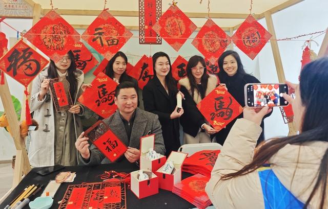 用毛笔写下“马”字和“福”字,市民共迎马年摄影:陶磊