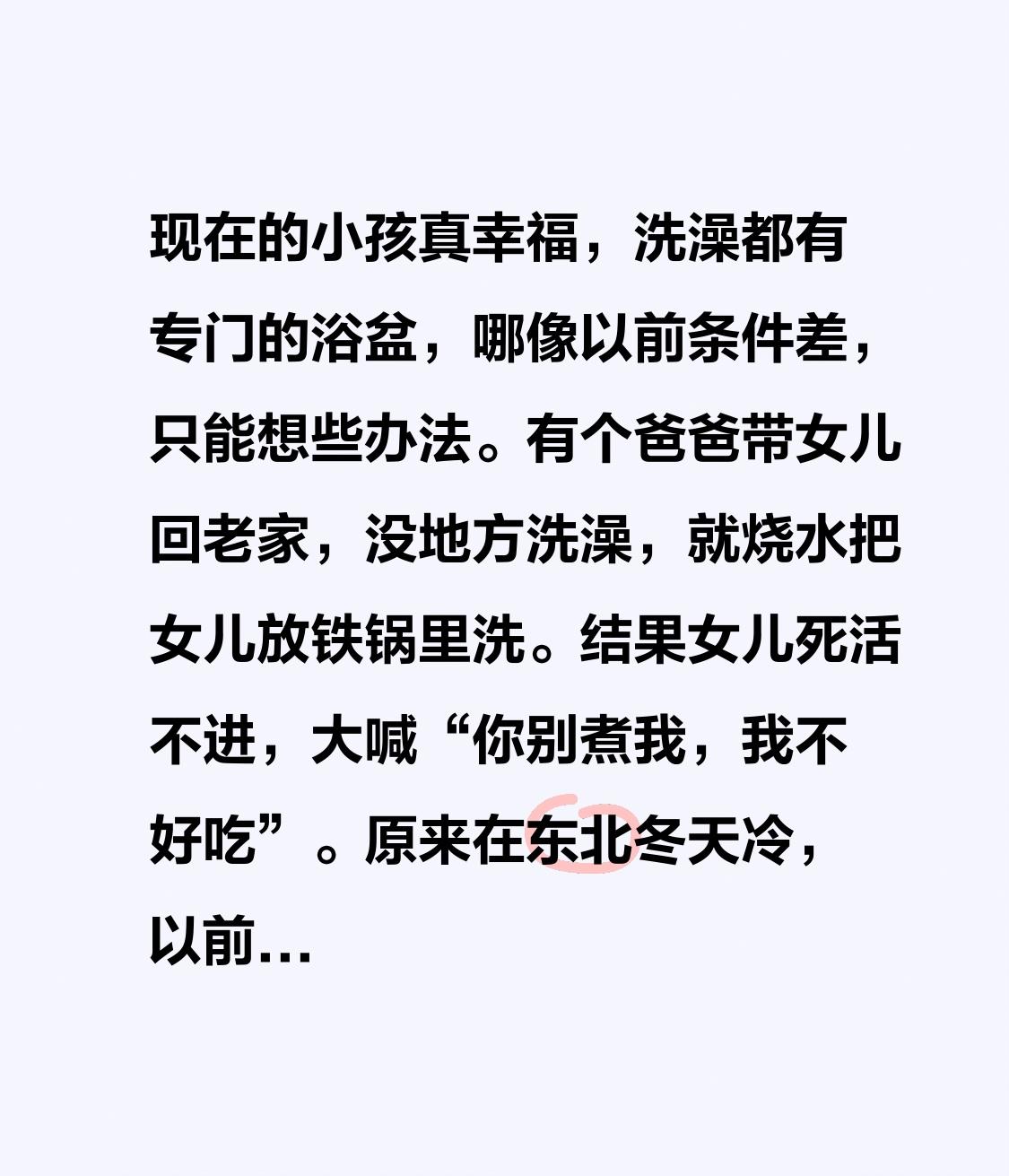 现在的小孩真幸福,洗澡都有专门的浴盆,哪像以前条件差,只能想些办法。有个爸爸带女儿回老家,没地方洗澡,就烧水把女儿放铁锅里洗。结果女儿死活不进,大喊“你别煮我,我不好吃”。原来在东北冬天冷,以前家里没条件去浴室,父母就烧锅水,放个小凳子让孩子坐锅里洗。这爸爸小时候也这么洗,觉得暖和舒服,可孩子没这概念,以为要被煮了,紧紧搂着爸爸儿童室内洗澡