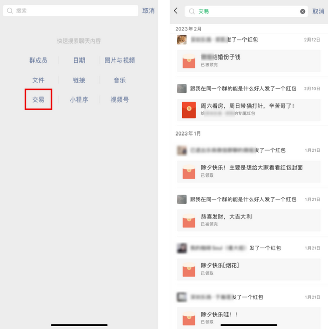 进入聊天详情点击“查找聊天内容-交易”,可以看到全部的交易内容,红包、转账都能查,每一次惊喜都有痕迹。