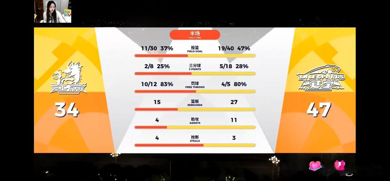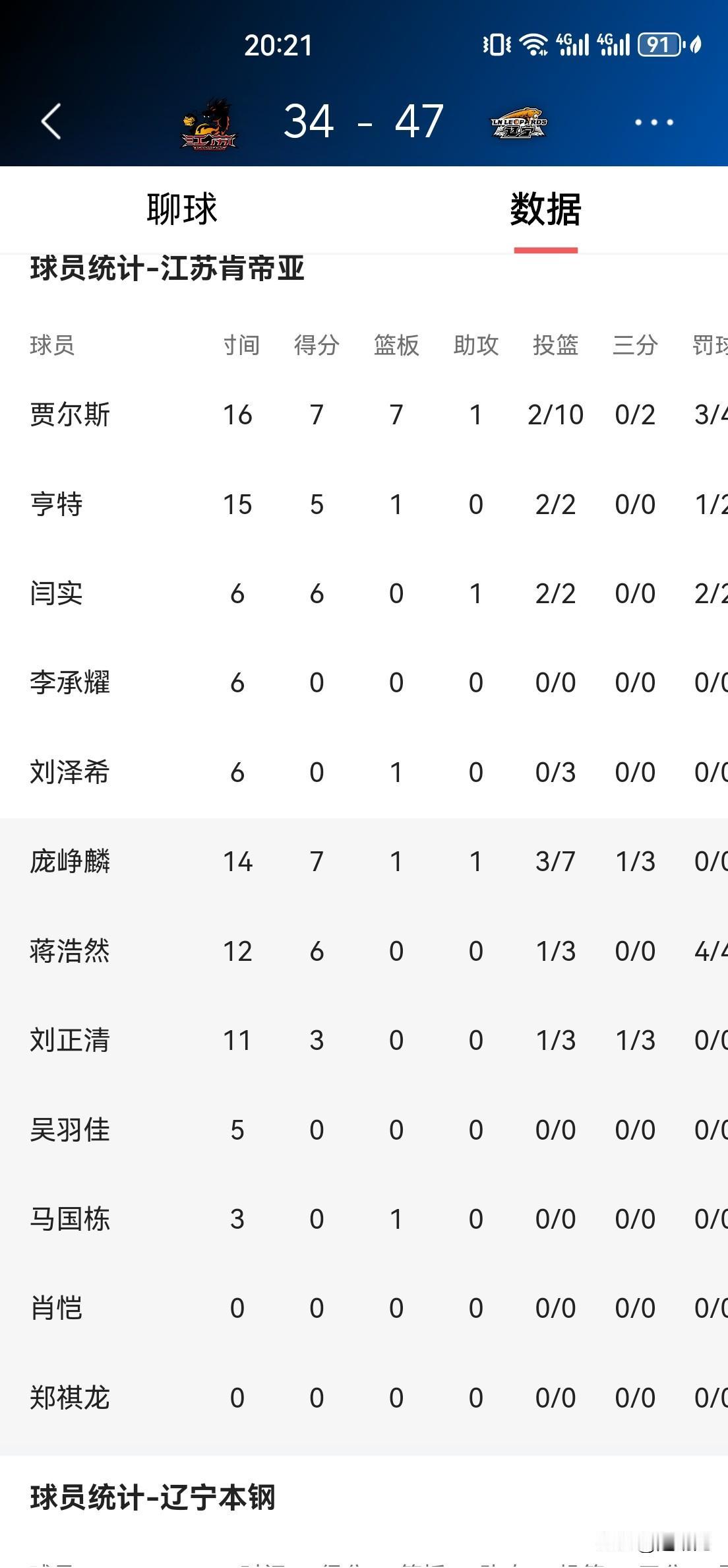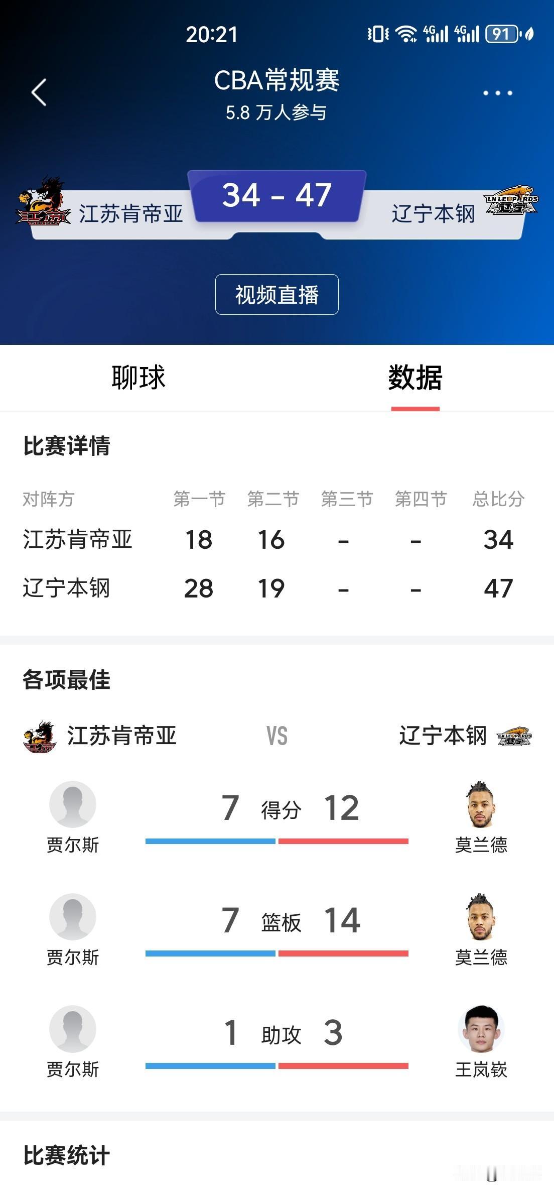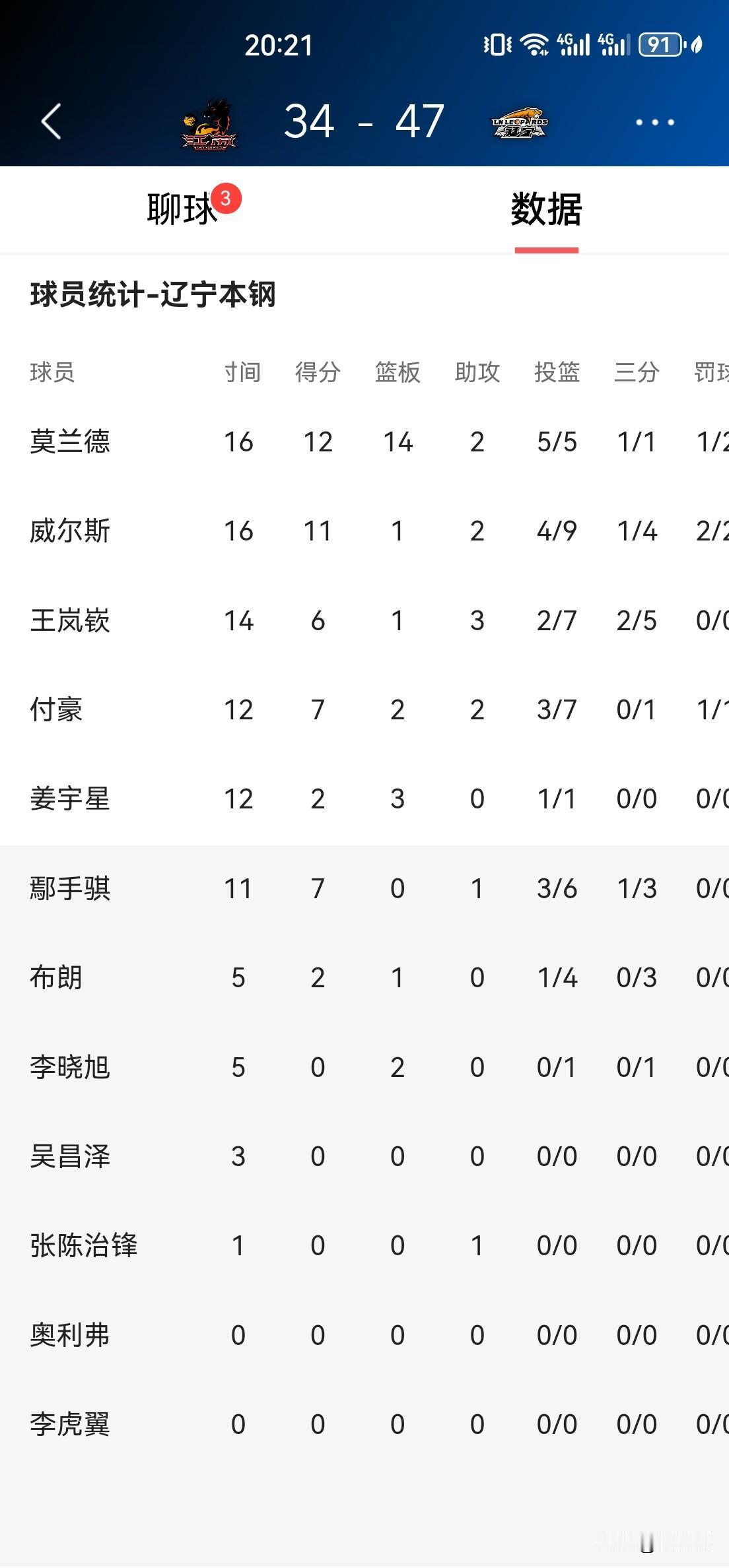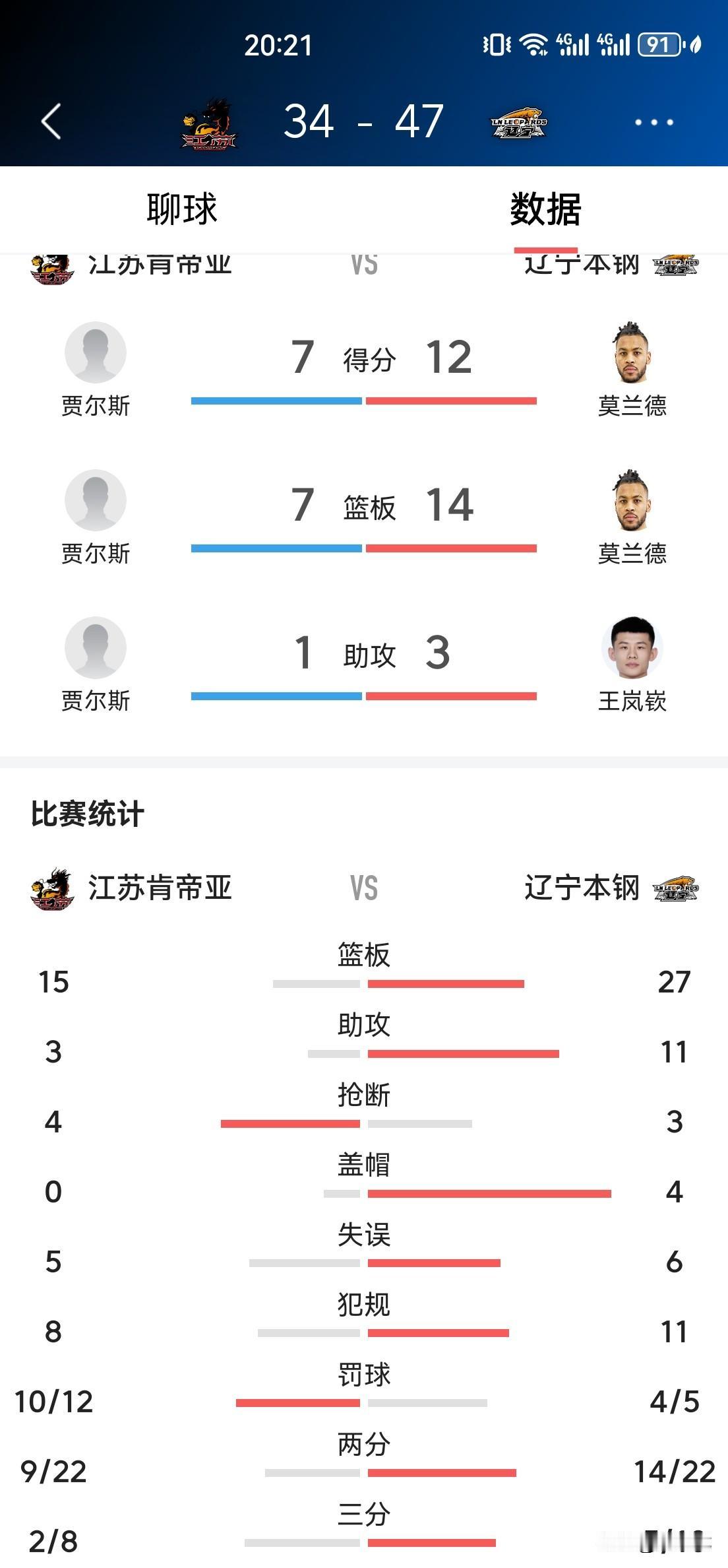 莫兰德统治前后场油漆区,广西老六庞峥麟独木难支,辽宁半场47:34客场领先江苏13分。 上半场莫兰德5投5中,拿到12分14篮板2助攻,帮助辽宁篮板球27:15多出江苏12个,投篮数辽宁40:30比江苏多出10次。 江苏仅两外援出战,只能经常出现单外援上场的情况,实力对比明显落后辽宁。庞峥麟上场14分钟,受辽宁专人追防,7投3中,拿到7分1篮板1助攻。