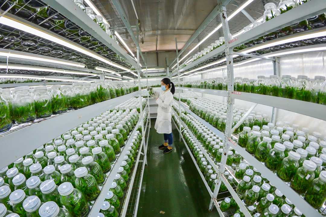 1月9日,工人在贵州省从江县贯洞镇铁皮石斛育苗基地的组培室里管护铁皮石斛苗。