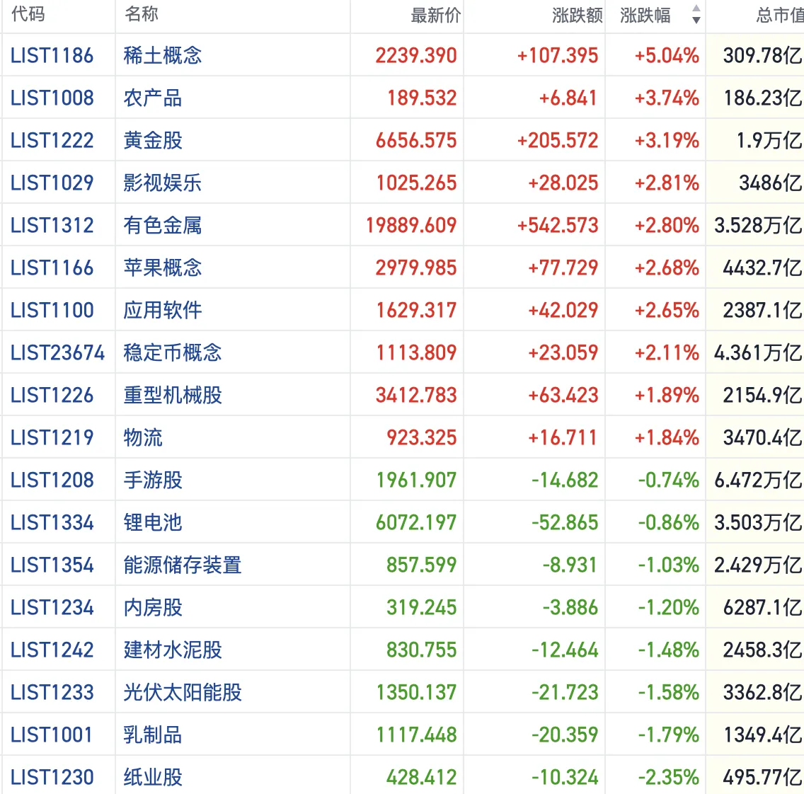 行情层面,今日各大热门板块依旧分化。主要受商品市场牛市效应带动,稀土、黄金、有色等资源股再度走强。