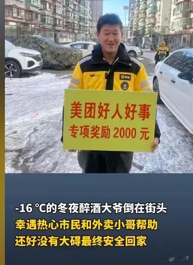 辽宁抚顺-16℃的冬夜,寒风像刀子似的刮脸,一名醉酒大爷横卧街头不省人事,危急时刻,一位美团骑手的暖心之举,成了最暖的光。 那天傍晚五点多,天却已经黑透了,在抚顺市东洲区绥化路的街头,一个年过六旬的老人趴在路边石上,双腿横在路面,一动不动。 当时气温低至-16℃,入夜后特别冷,要是没人管,后果真的不堪设想。 就在这时,美团骑手李春雷刚好送外卖时路过,看到路边有一个人横趴着,于是立马掉头折返查看。 一看,原来是个老人喝醉了,李春雷担心过往车辆碰到老人,就守在旁边守护。同时,报警,等候警车过来。 幸运的是,巡逻民警很快赶到,认出老人姓杜,目前独居,于是顺利把他送回了家。 李春雷本可以继续去接新订单,可他却选择转身守护陌生人的安危。这份善意不是惊天动地的壮举,却在寒冬里透着滚烫的温度,就像黑暗中的萤火,虽微弱却足以照亮人心。 更让人暖心的是,这件事后来被美团平台得知后,授予李春雷“先锋骑手”称号并发放好人好事奖金。 我觉得这份奖励太有意义了,他让善行被看见、被认可,形成了“善举有回报”的温暖循环。 而平台用现金奖励方式,实际也是传递正能量,让我们看到,每一份平凡的善意都值得被尊重。 寒冬虽冷,人心可暖。李春雷的善意,美团的担当,让这座城市充满温情。愿这样的好人好事越来越多,愿每一份善意都能被温柔以待。