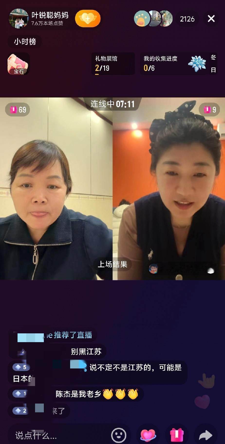 叶锐聪妈妈直播间里今晚有个黑粉闯入,对叶锐聪妈妈所说的话种种不理解,说叶锐聪妈妈一天喝11瓶水是假话,当叶锐聪妈妈和陈杰妈妈连线时,他又来到陈杰妈妈直播间,怀疑陈杰妈妈寻找儿子不是真心的。但是这两位妈妈都没有怼黑粉,也没有拉黑他,说明她们真的很有格局,容得下所有好的、不中听话语。期待陈杰妈妈早日找到自己的孩子!
