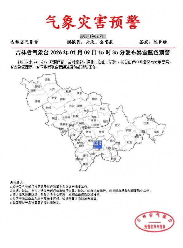 吉林省气象台1月9日15时35分发布暴雪蓝色预警:预计未来24小时,辽源南部、吉林市南部、通化、白山、延边州、长白山保护开发区有大到暴雪省应急管理厅、省气象局联合提醒注意做好预防工作。