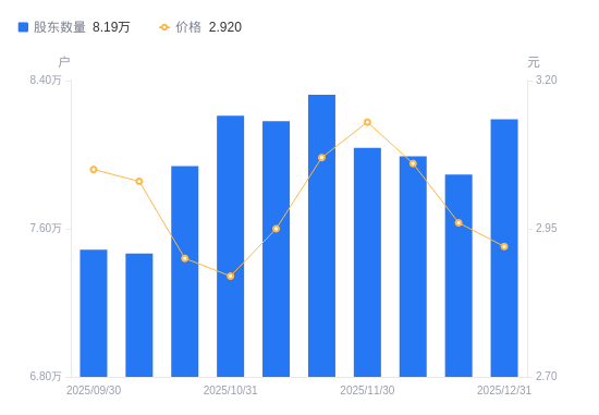 日期A股户数(户)流通A股户均持股数(股)户均持股市值(万元)2025-12-318191027541.678.042025-12-207892228584.418.462025-12-107990528232.768.642025-11-308036428071.518.792025-11-208323527103.248.322025-11-108181027575.348.132025-10-318210827475.267.892025-10-207937728420.568.242025-10-107466230215.359.162025-09-307486330134.229.19