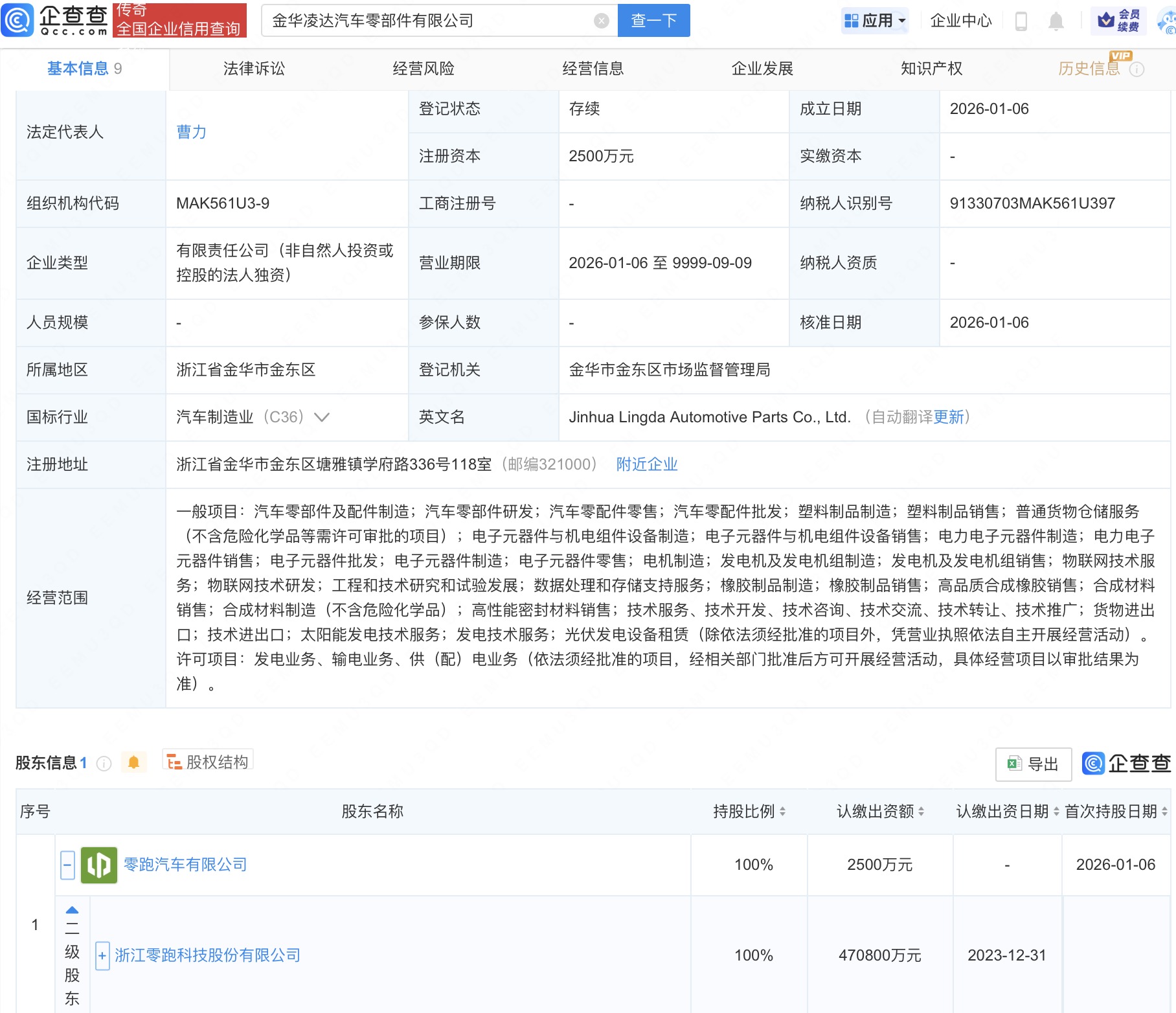 企查查APP显示,近日,金华凌达汽车零部件有限公司成立,法定代表人为曹力,注册资本2500万人民币,经营范围含汽车零部件及配件制造、汽车零部件研发、汽车零配件零售、电子元器件与机电组件设备制造、太阳能发电技术服务等。企查查股权穿透显示,该公司由零跑汽车(09863.HK)间接全资持股。